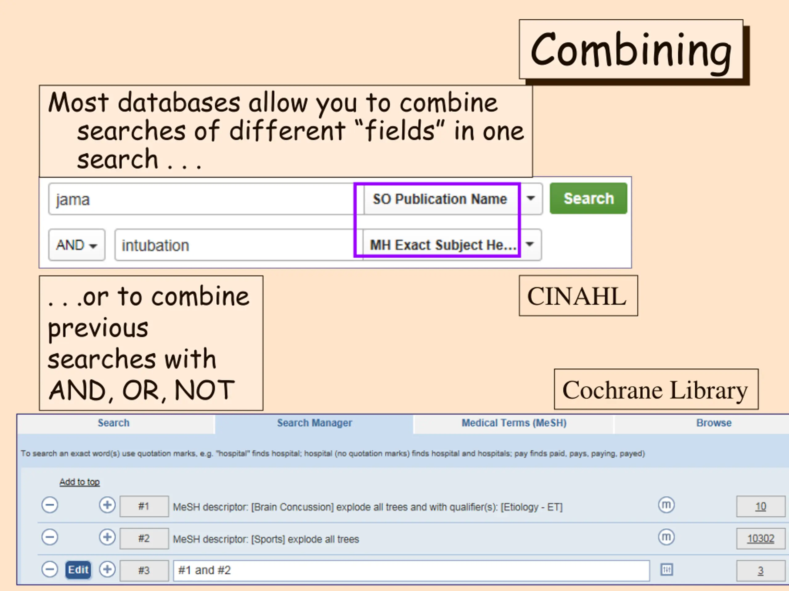 Combining Most databases allow you to combine searches of different fields in one search . . . . . .or to combine previous searches with AND, OR, NOT CINAHL Cochrane Library