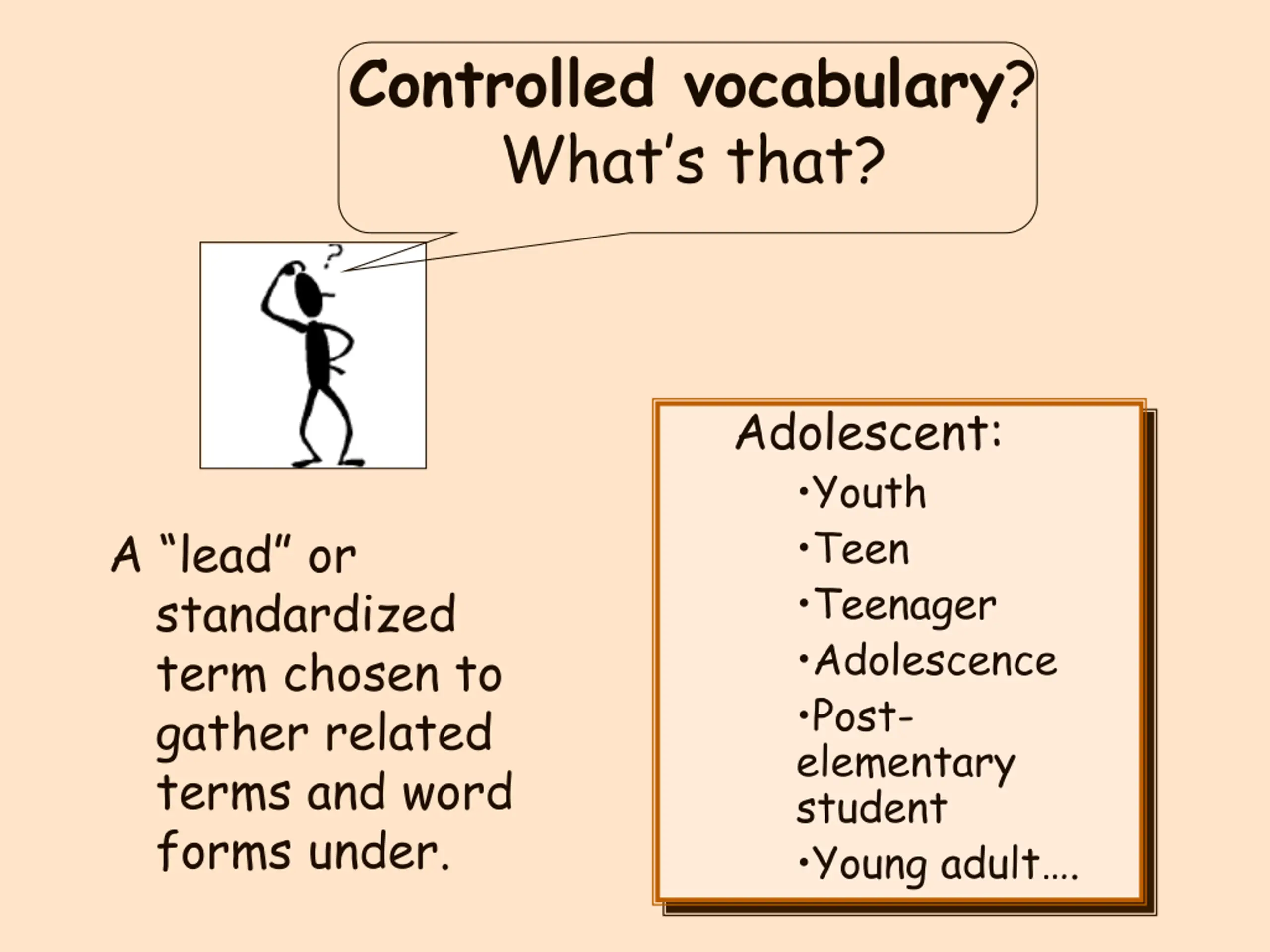 Controlled vocabulary? What s that? Adolescent: Youth Teen Teenager Adolescence Post- elementary student Young adult . A lead or standardized term chosen to gather related terms and word forms under.