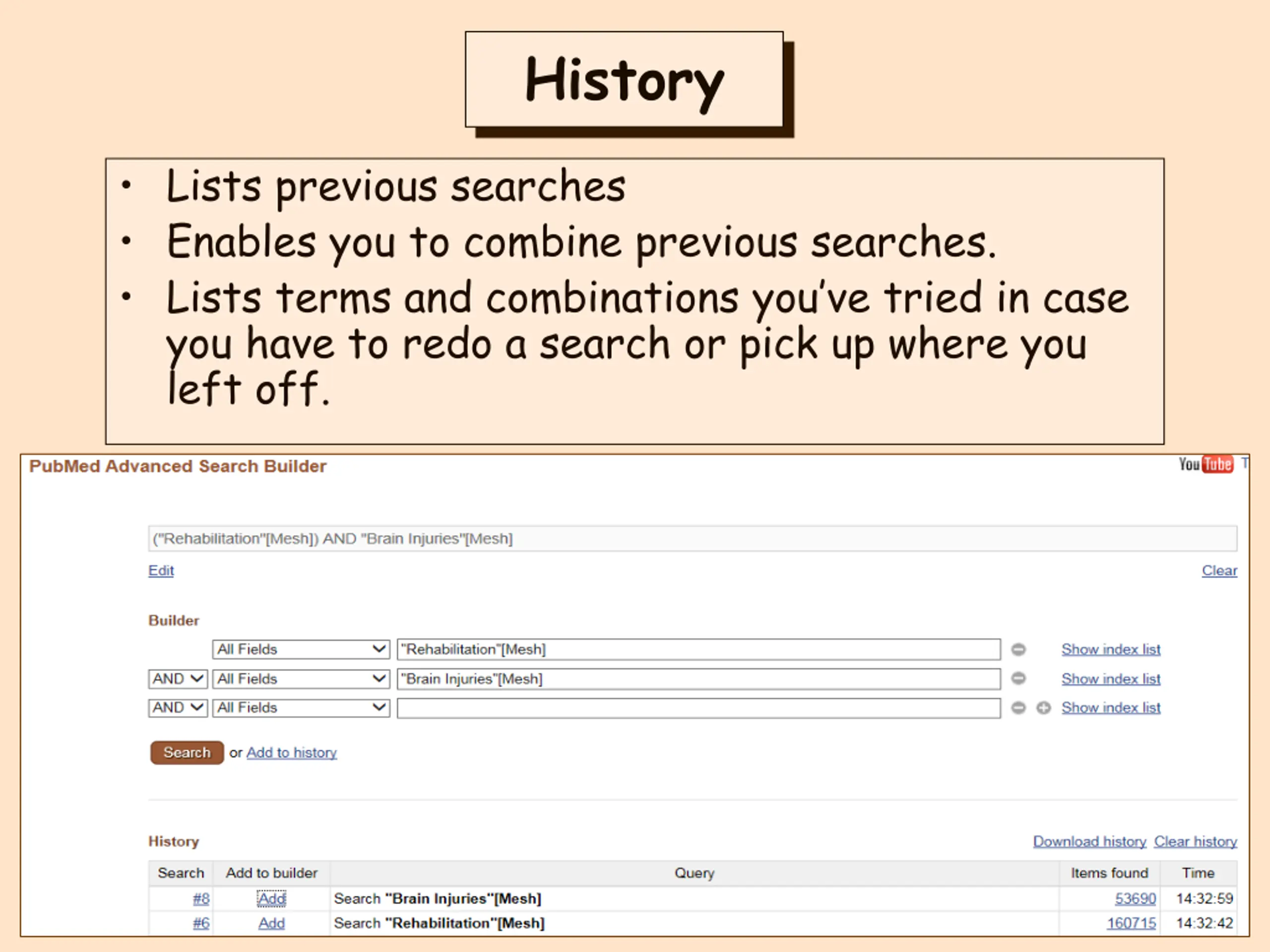 History Lists previous searches Enables you to combine previous searches. Lists terms and combinations you ve tried in case you have to redo a search or pick up where you left off. PubMed