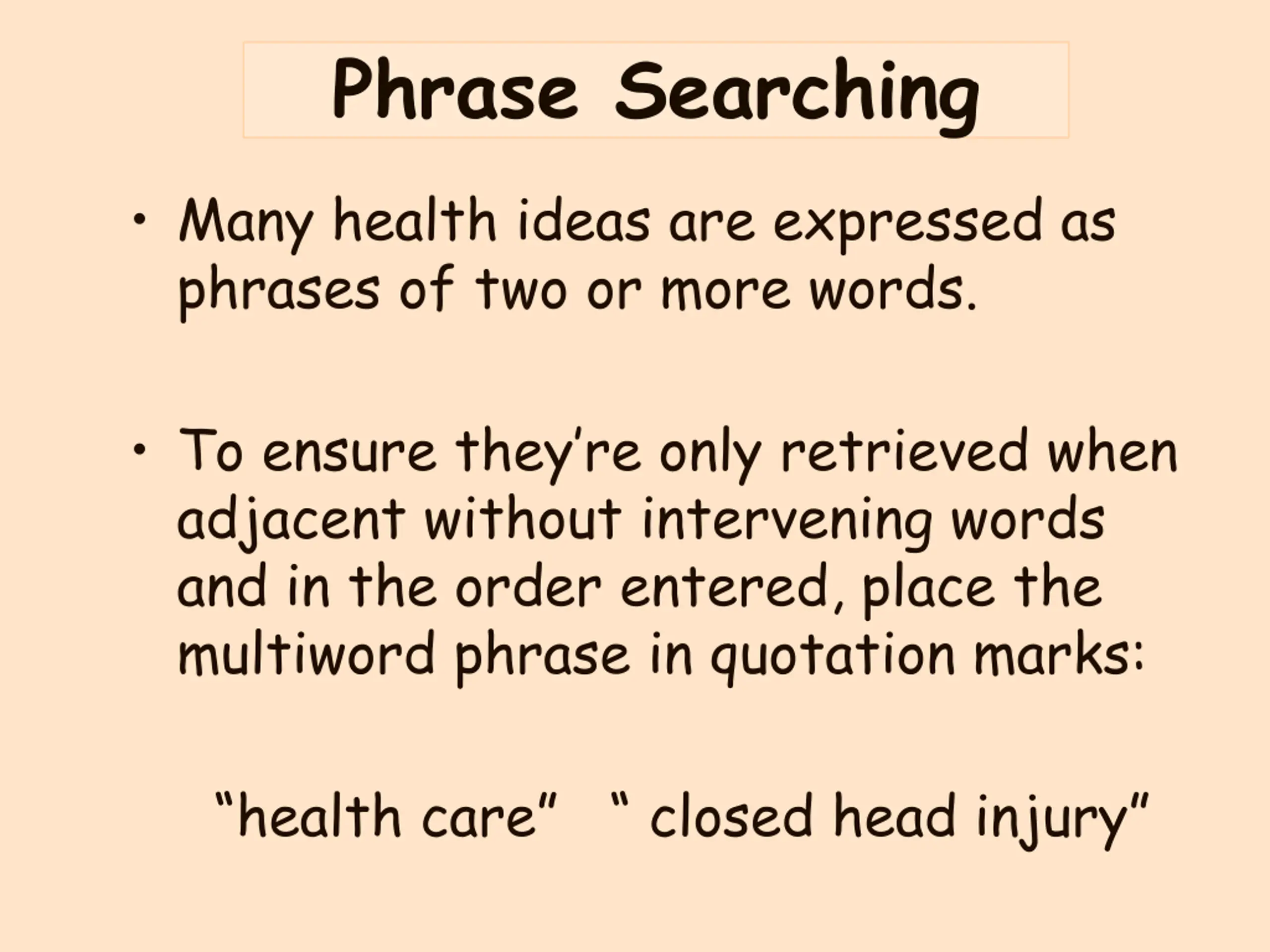 Phrase Searching Many health ideas are expressed as phrases of two or more words. To ensure they re only retrieved when adjacent without intervening words and in the order entered, place the multiword phrase in quotation marks: health care closed head injury