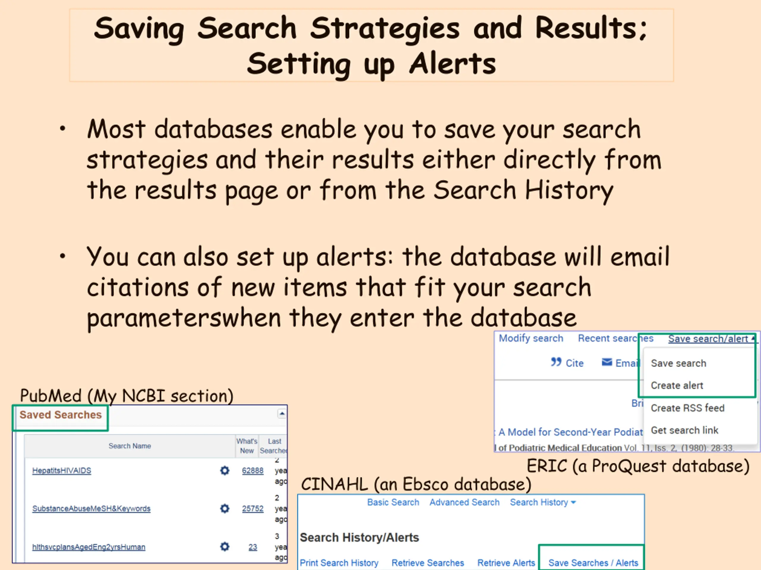 Saving Search Strategies and Results; Setting up Alerts Most databases enable you to save your search strategies and their results either directly from the results page or from the Search History You can also set up alerts: the database will email citations of new items that fit your search parameterswhen they enter the database PubMed (My NCBI section) ERIC (a ProQuest database) CINAHL (an Ebsco database)