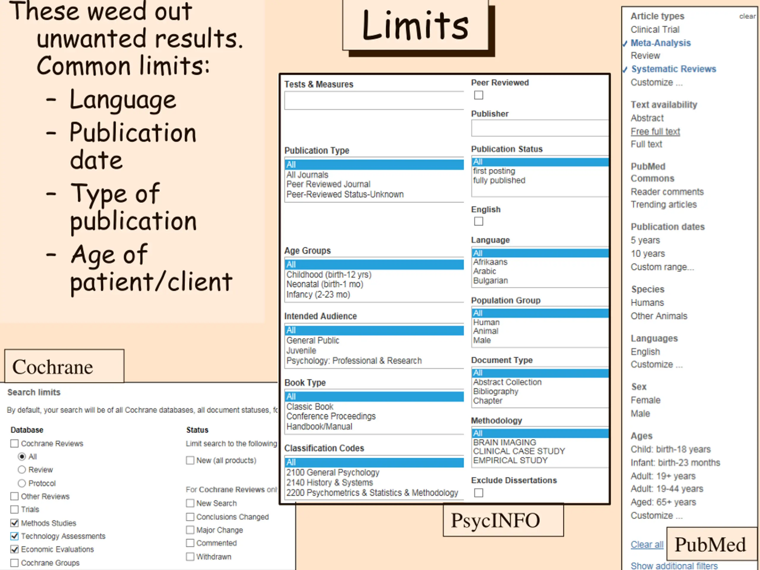 These weed out unwanted results. Common limits: Language Publication date Type of publication Age of patient/client Limits PsycINFO Cochrane PsycINFO PubMed