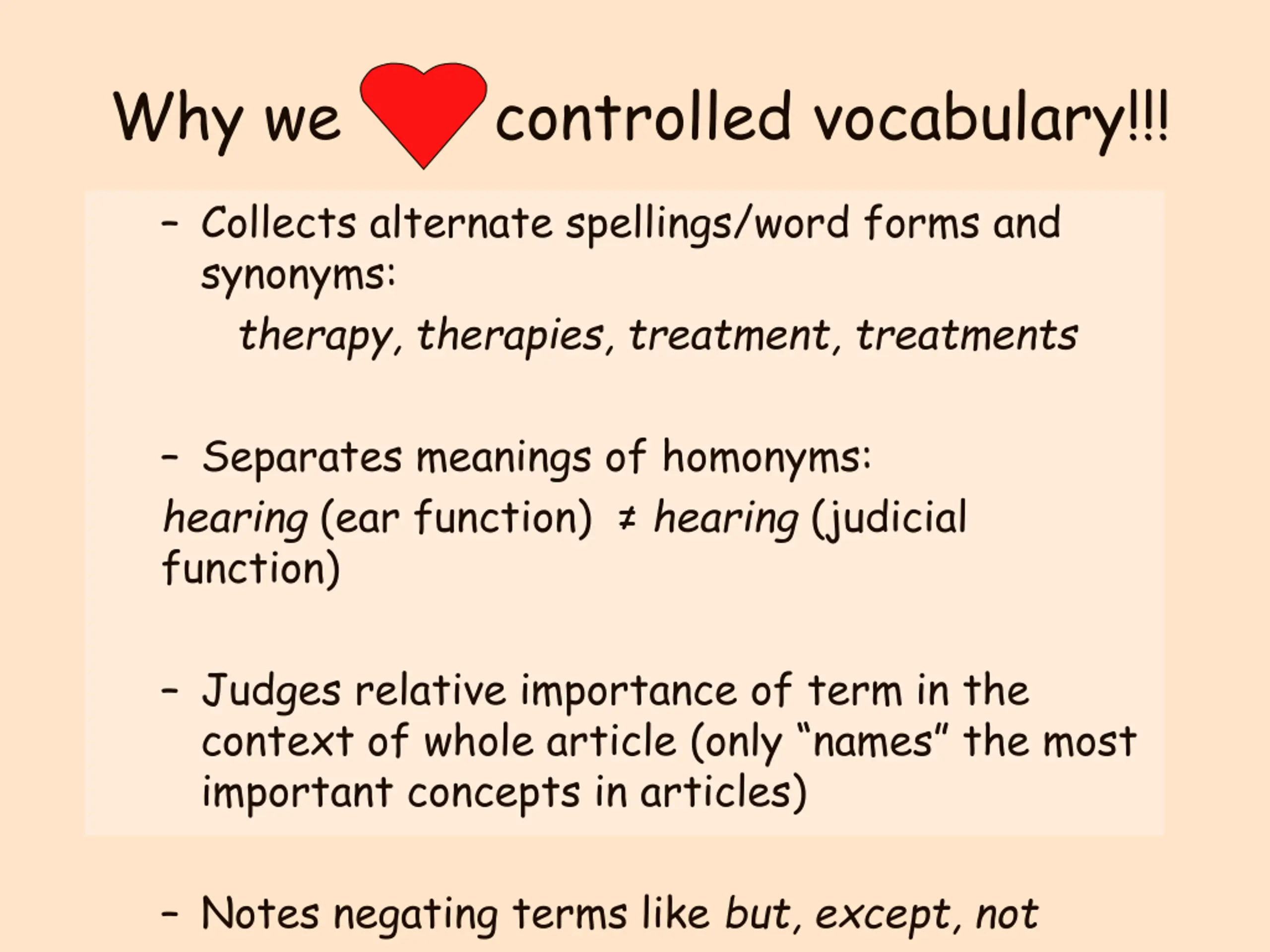 Why we controlled vocabulary!!! Collects alternate spellings/word forms and synonyms: therapy, therapies, treatment, treatments Separates meanings of homonyms: hearing(ear function) hearing (judicial function) Judges relative importance of term in the context of whole article (only names the most important concepts in articles) Notes negating terms like but, except, not
