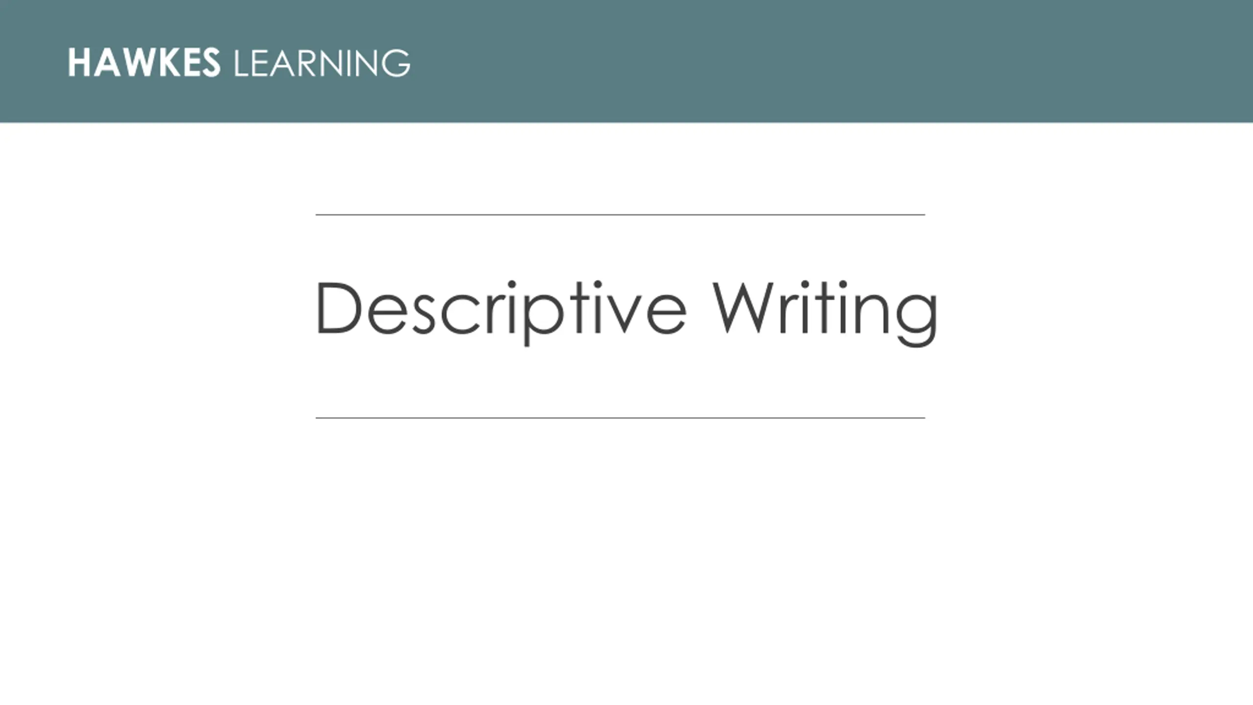 Lesson Goals Key elements of descriptive writing Organizing words, sentences, and paragraphs Different types of description Enhancing description with sensory details HAWKES LEARNING