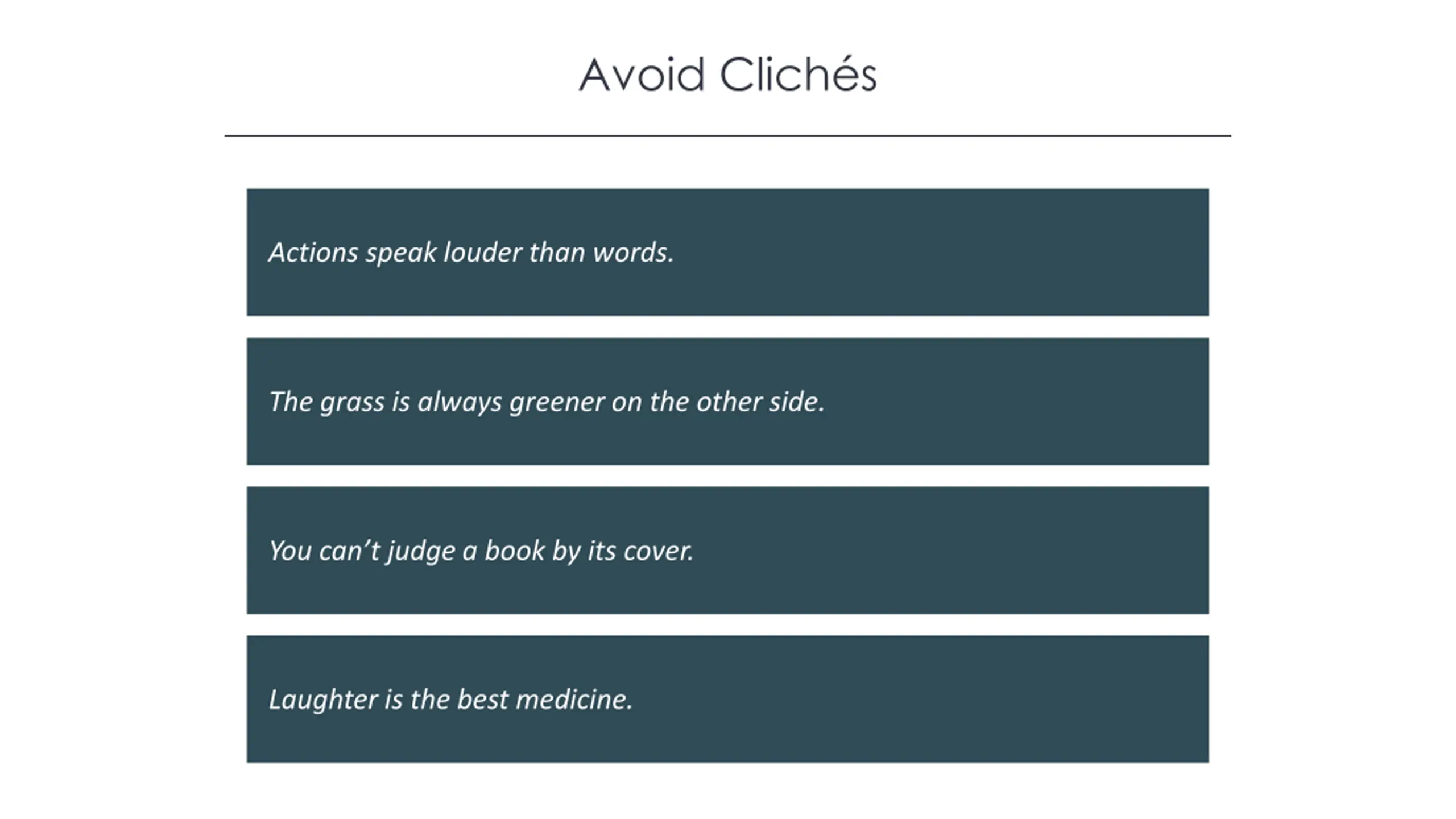 Avoid Clichs Actions speak louder than words. The grass is always greener on the other side. You can t judge a book by its cover. Laughter is the best medicine. HAWKES LEARNING