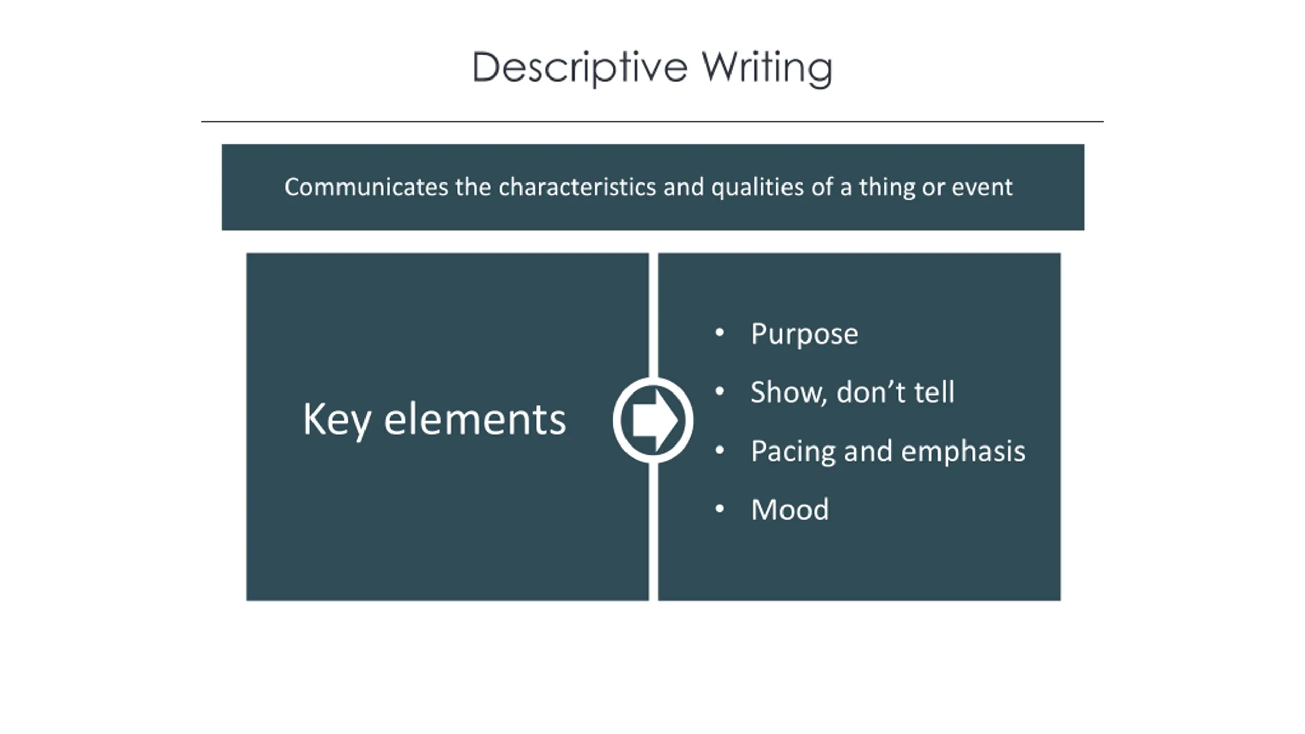 Descriptive Writing Communicates the characteristics and qualities of a thing or event Purpose Show, don t tell Key elements Pacing and emphasis Mood HAWKES LEARNING