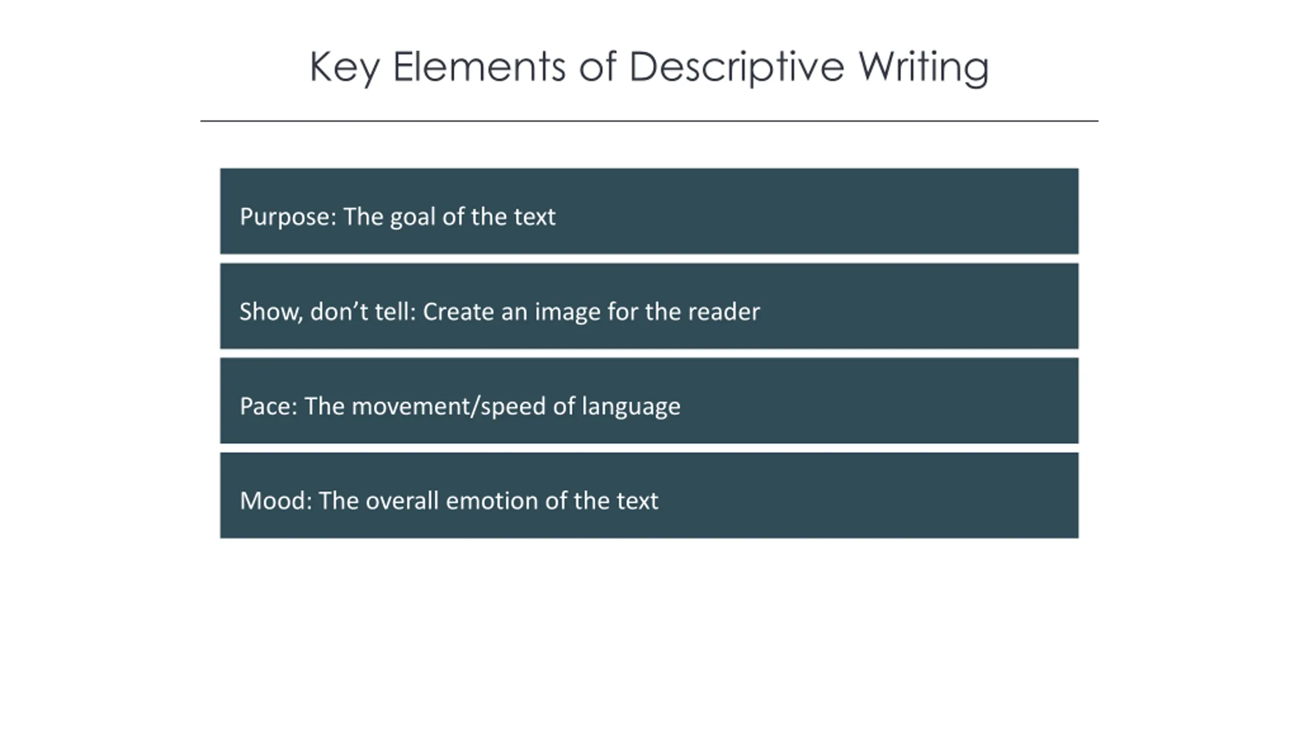 Key Elements of Descriptive Writing Purpose: The goal of the text Show, don t tell: Create an image for the reader Pace: The movement/speed of language Mood: The overall emotion of the text HAWKES LEARNING