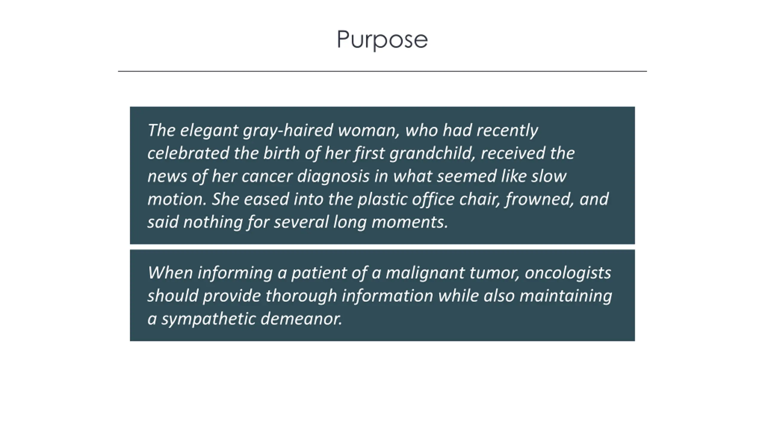 Purpose The elegant gray-haired woman, who had recently celebrated the birth of her first grandchild, received the news of her cancer diagnosis in what seemed like slow motion. She eased into the plastic office chair, frowned, and said nothing for several long moments. When informing a patient of a malignant tumor, oncologists should provide thorough information while also maintaining a sympathetic demeanor. HAWKES LEARNING
