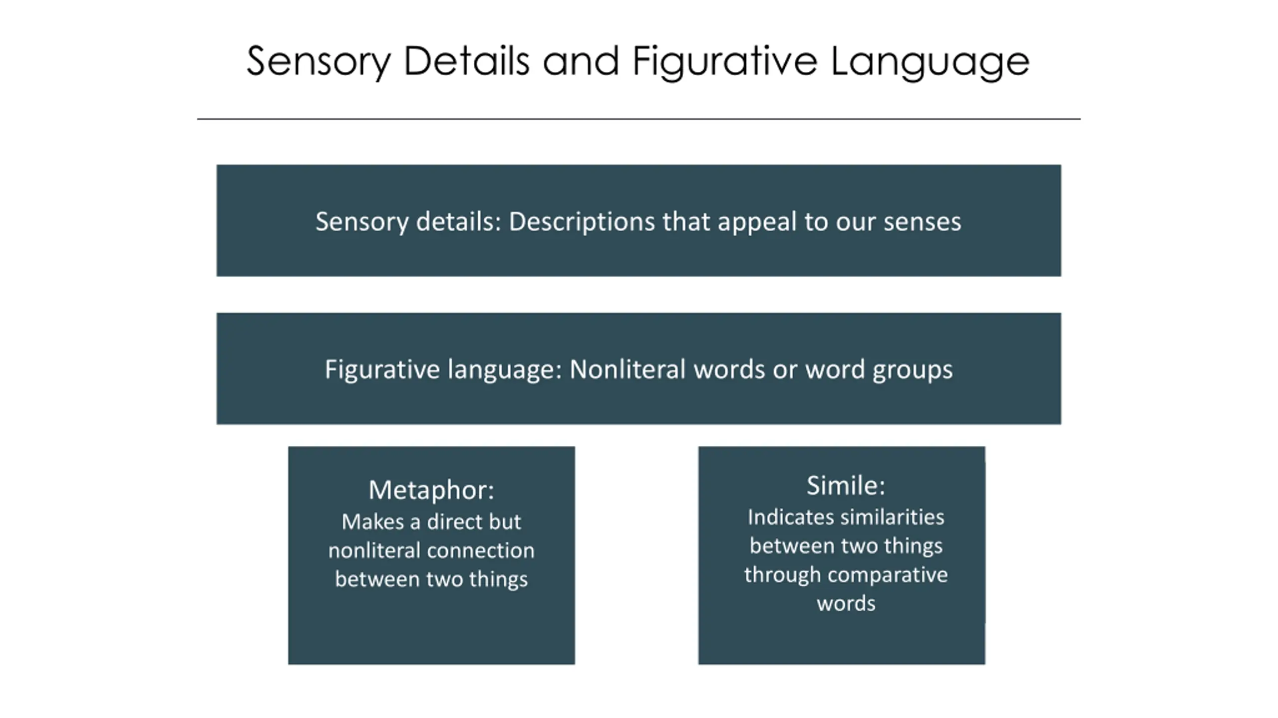Sensory Details and Figurative Language Sensory details: Descriptions that appeal to our senses Figurative language: Nonliteral words or word groups Simile: Metaphor: Makes a direct but nonliteral connection between two things Indicates similarities between two things through comparative words