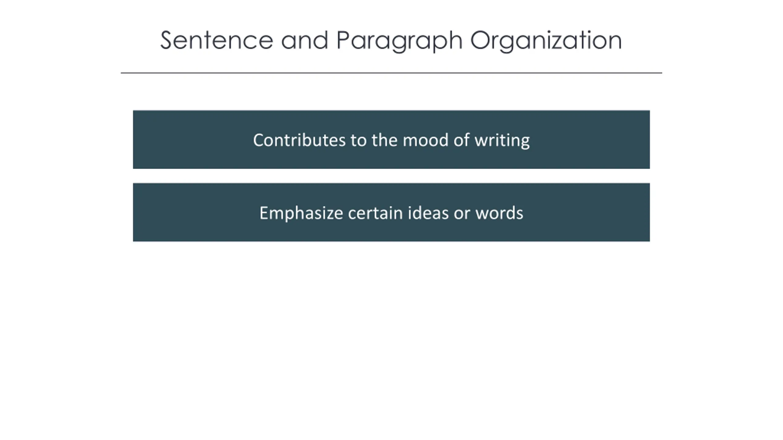 Sentence and Paragraph Organization Contributes to the mood of writing Emphasize certain ideas or words HAWKES LEARNING