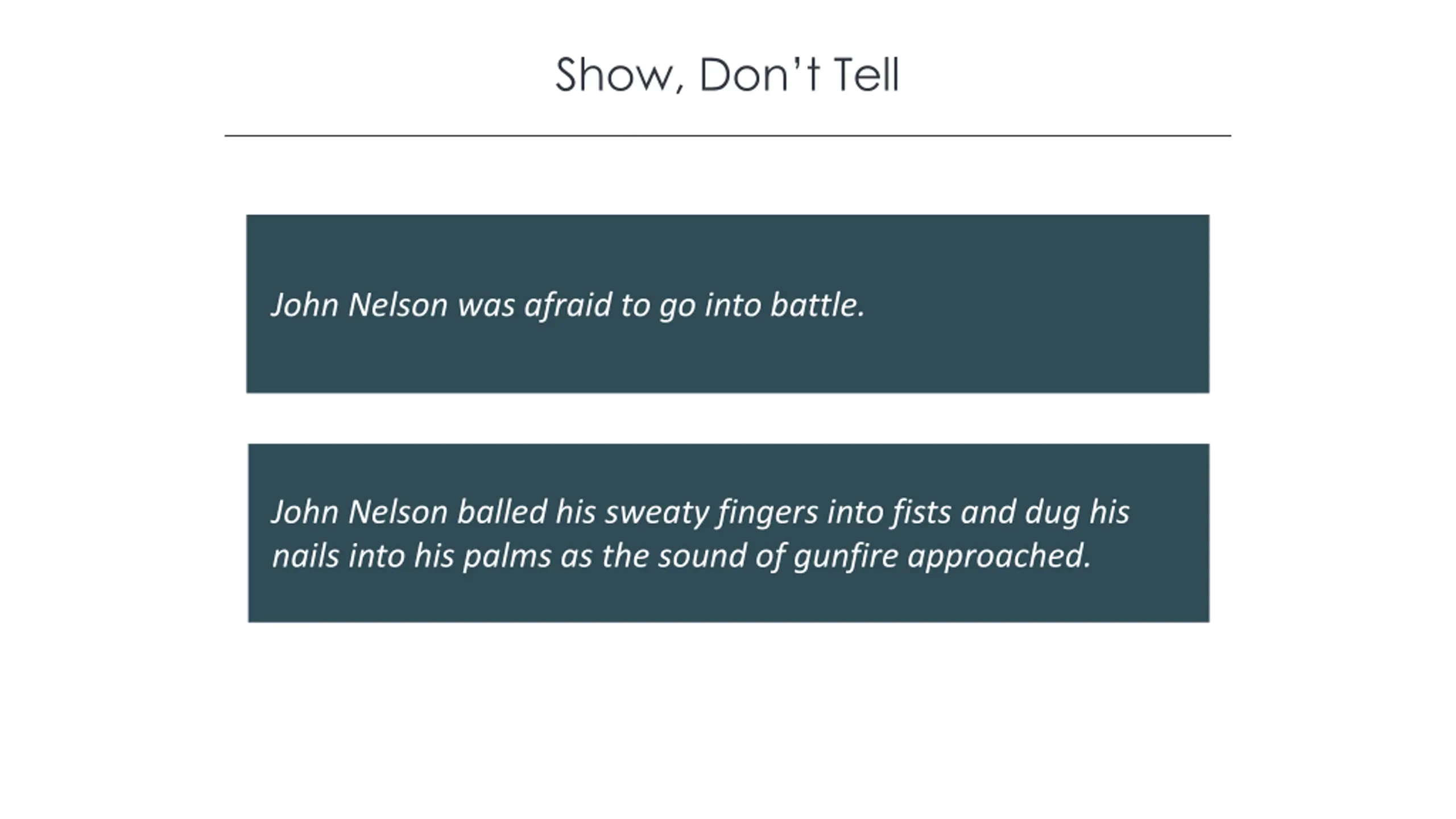 Show, Dont Tell John Nelson was afraid to go into battle. John Nelson balled his sweaty fingers into fists and dug his nails into his palms as the sound of gunfire approached. HAWKES LEARNING