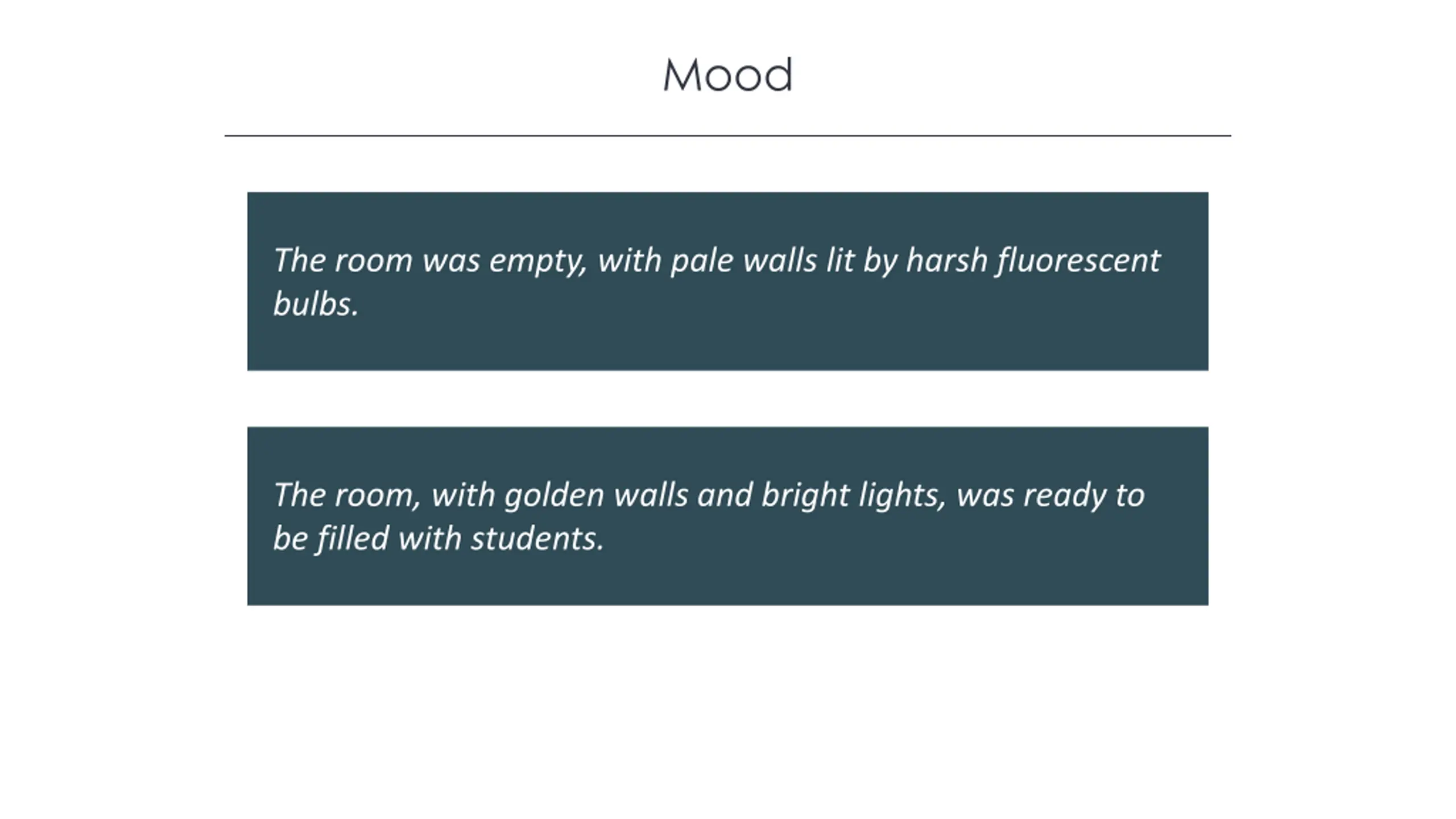 Mood The room was empty, with pale walls lit by harsh fluorescent bulbs. The room, with golden walls and bright lights, was ready to be filled with students. HAWKES LEARNING