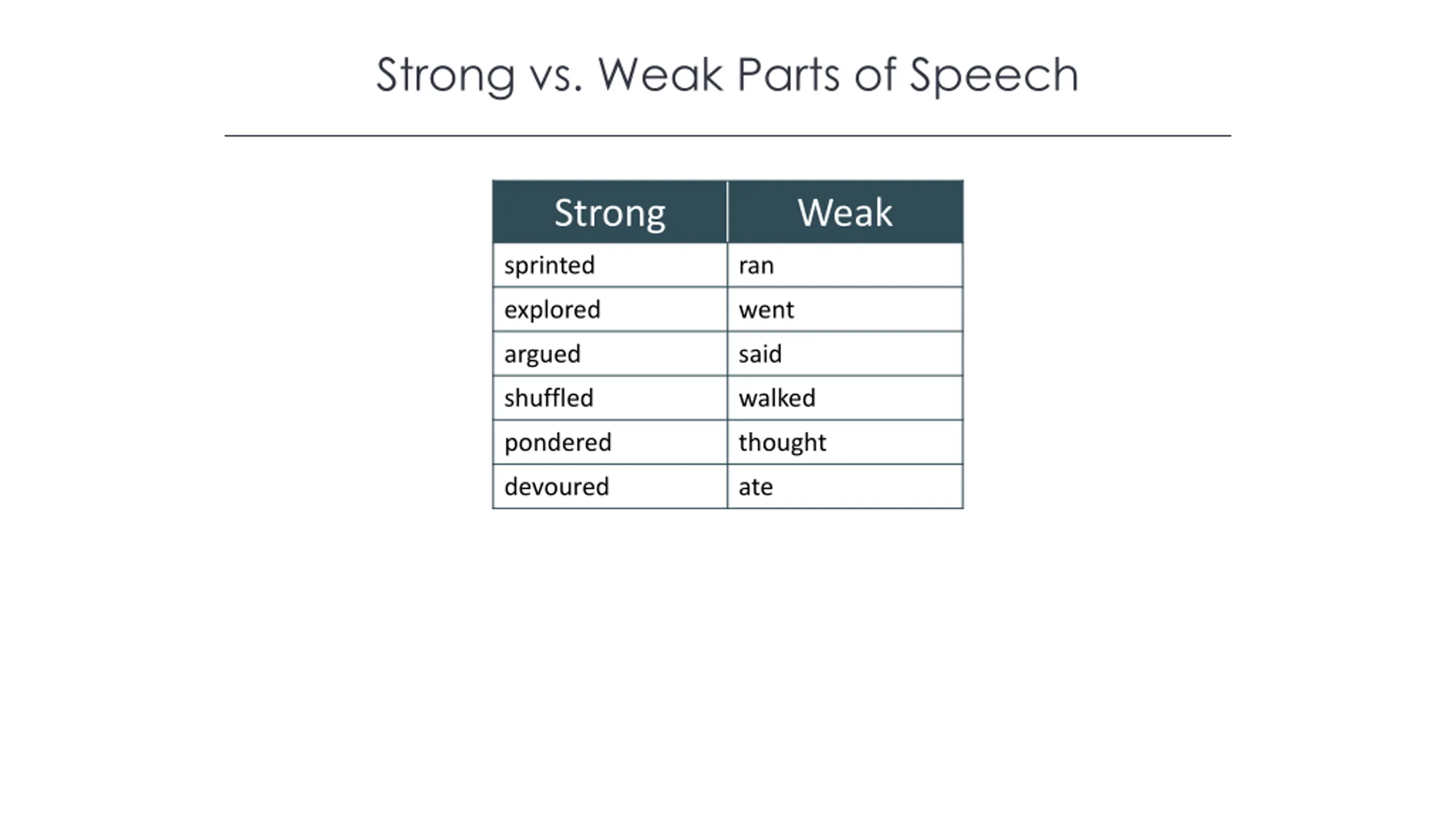 Strong vs. Weak Parts of Speech Strong Weak sprinted ran explored went argued said shuffled walked pondered thought devoured ate HAWKES LEARNING