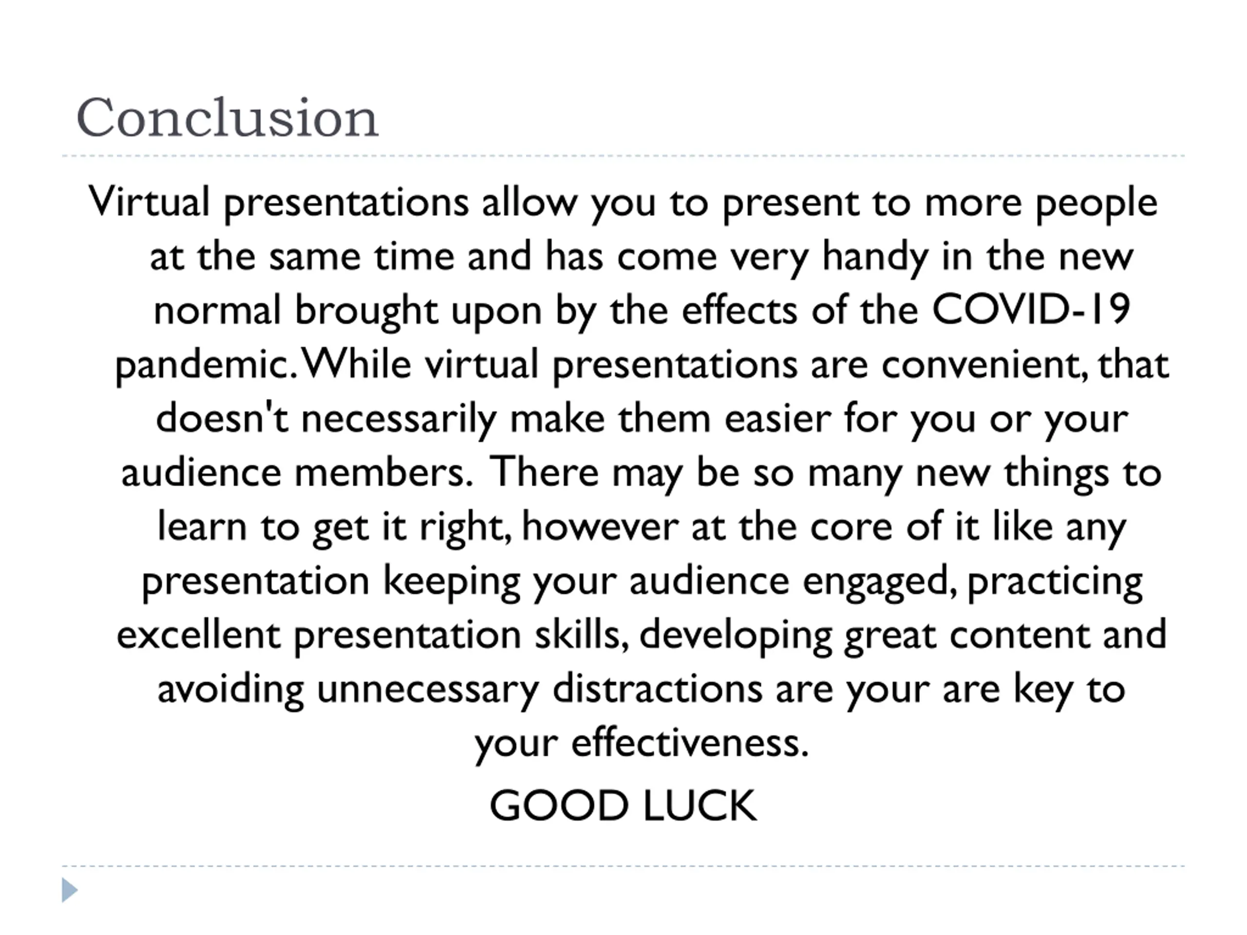 Conclusion Virtual presentations allow you to present to more people at the same time and has come very handy in the new normal brought upon by the effects of the COVID-19 pandemic. While virtual presentations are convenient, that doesn't necessarily make them easier for you or your audience members. There may be so many new things to learn to get it right, however at the core of it like any presentation keeping your audience engaged, practicing excellent presentation skills, developing great content and avoiding unnecessary distractions are your are key to your effectiveness. GOOD LUCK