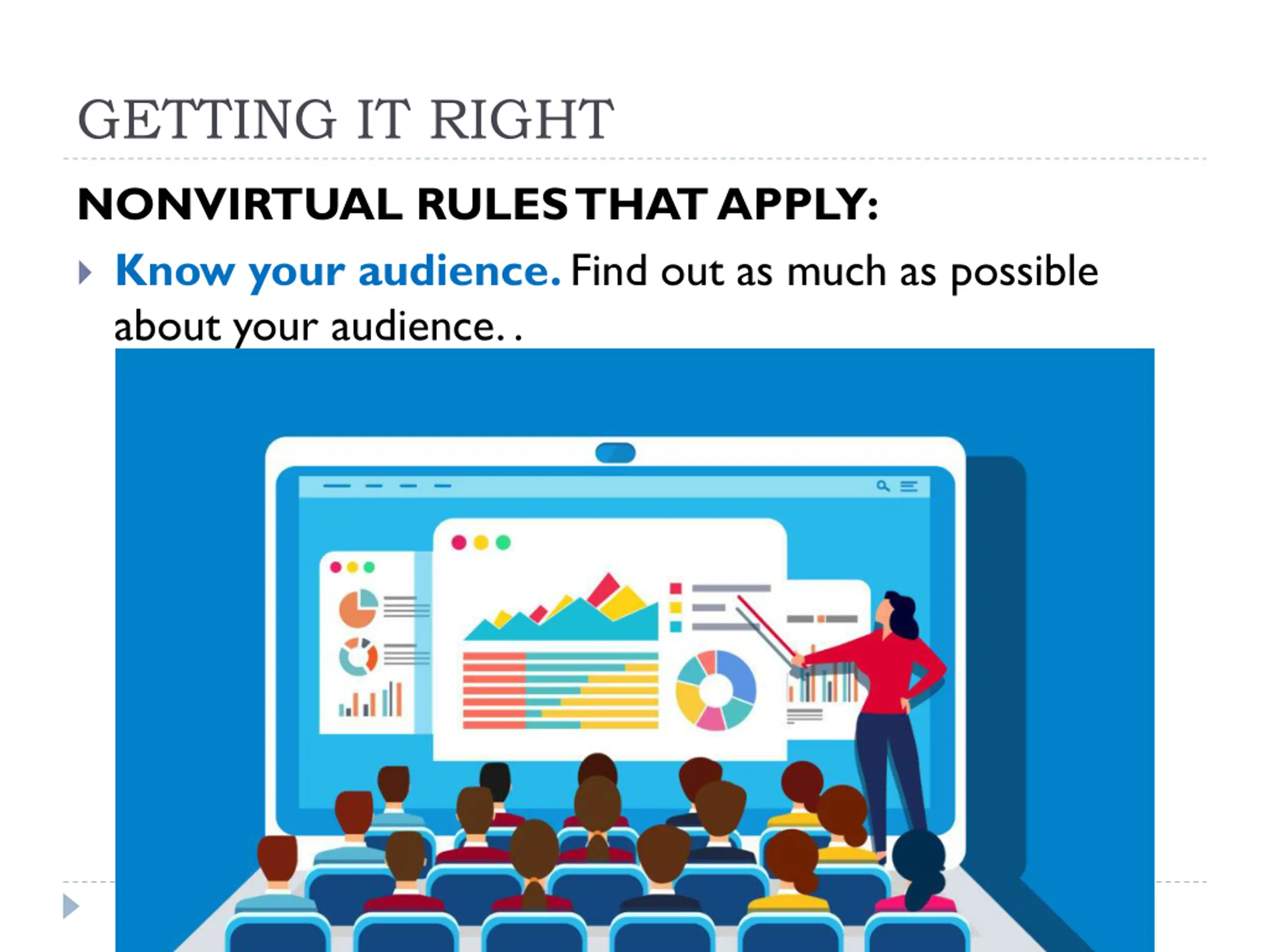 GETTING IT RIGHT NONVIRTUAL RULES THAT APPLY: Know your audience.Find out as much as possible about your audience. .