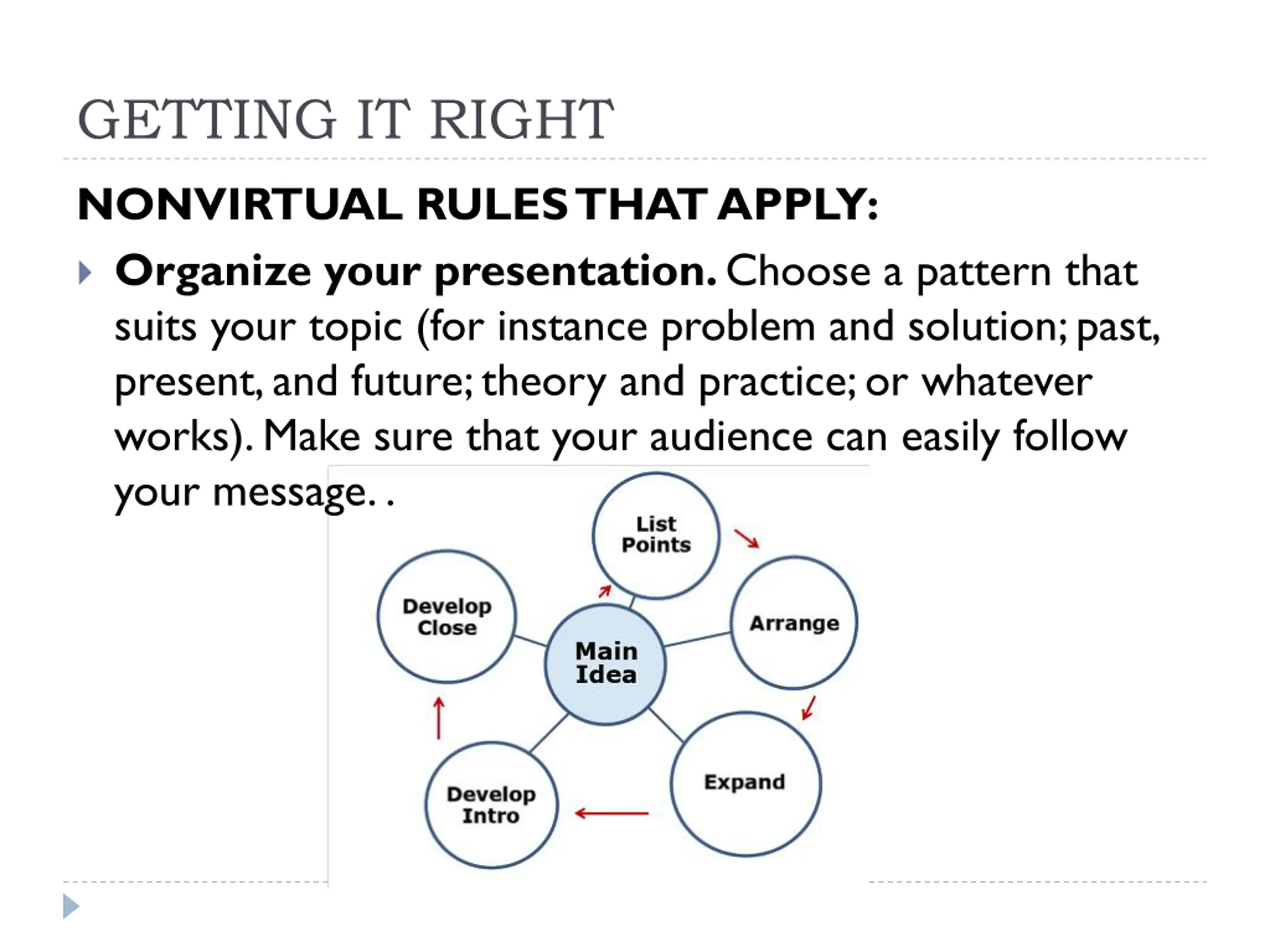 GETTING IT RIGHT NONVIRTUAL RULES THAT APPLY: Organize your presentation.Choose a pattern that suits your topic (for instance problem and solution; past, present, and future; theory and practice; or whatever works). Make sure that your audience can easily follow your message. .