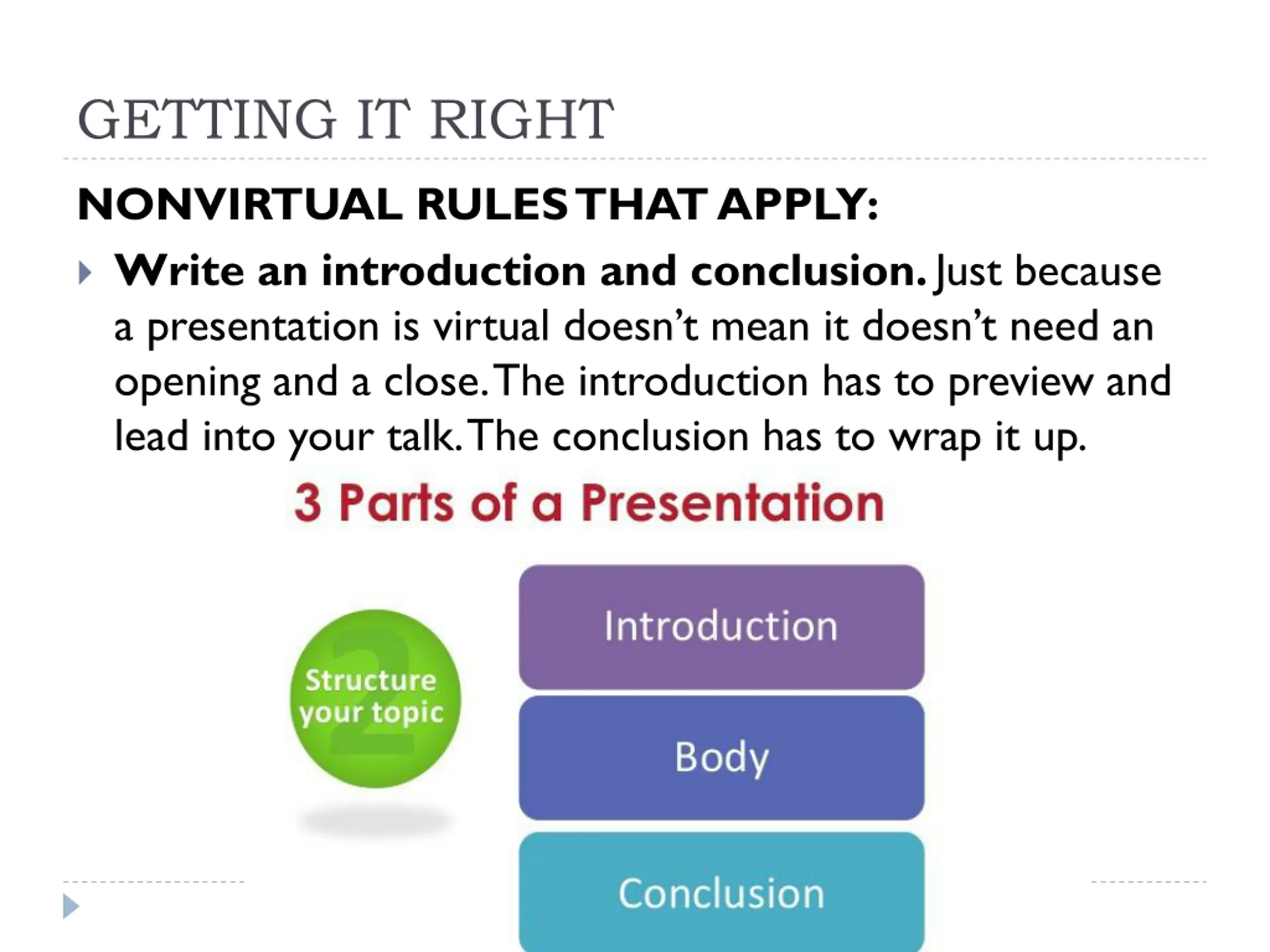 GETTING IT RIGHT NONVIRTUAL RULES THAT APPLY: Write an introduction and conclusion.Just because a presentation is virtual doesn t mean it doesn t need an opening and a close. The introduction has to preview and lead into your talk. The conclusion has to wrap it up.