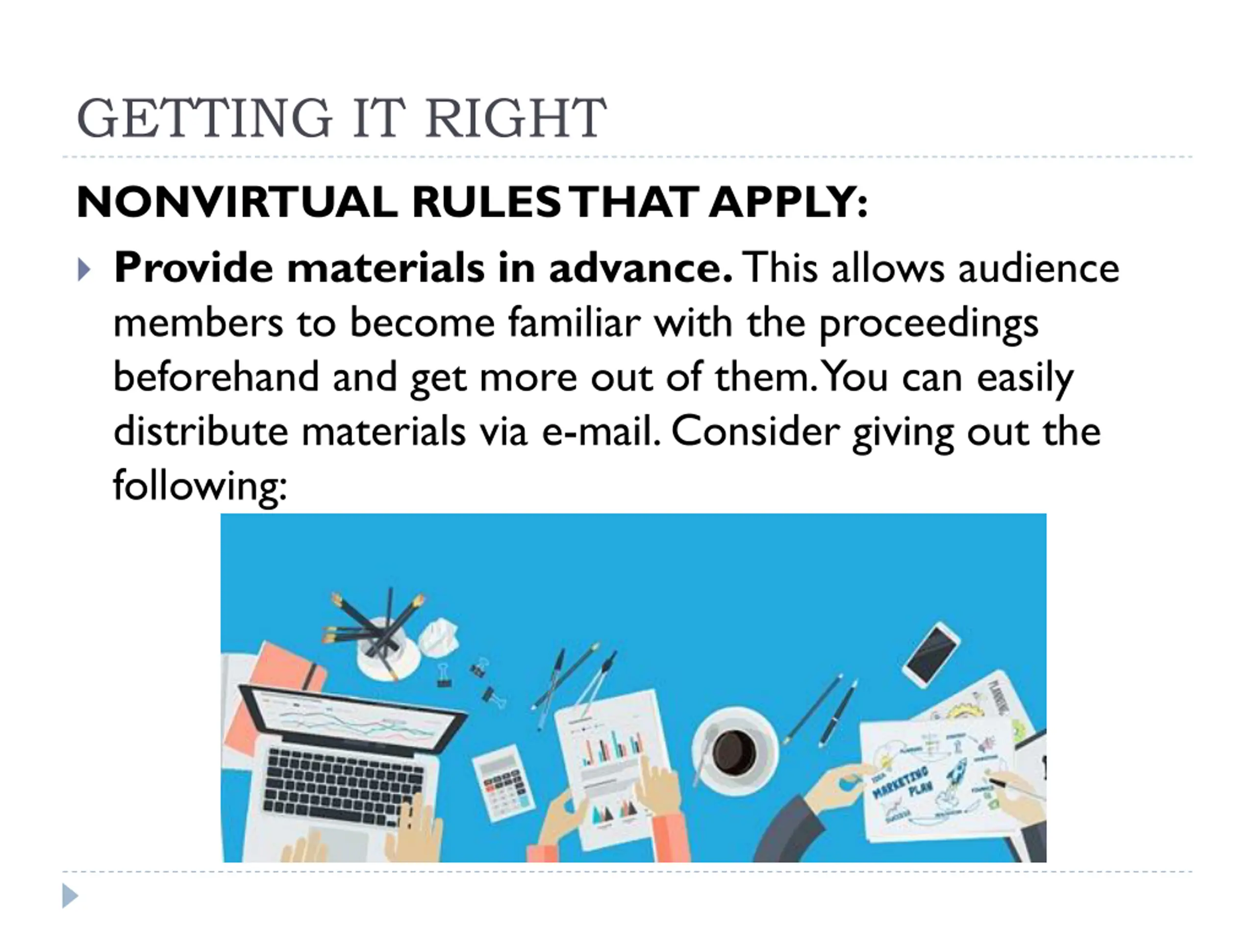 GETTING IT RIGHT NONVIRTUAL RULES THAT APPLY: Provide materials in advance.This allows audience members to become familiar with the proceedings beforehand and get more out of them. You can easily distribute materials via e-mail. Consider giving out the following: