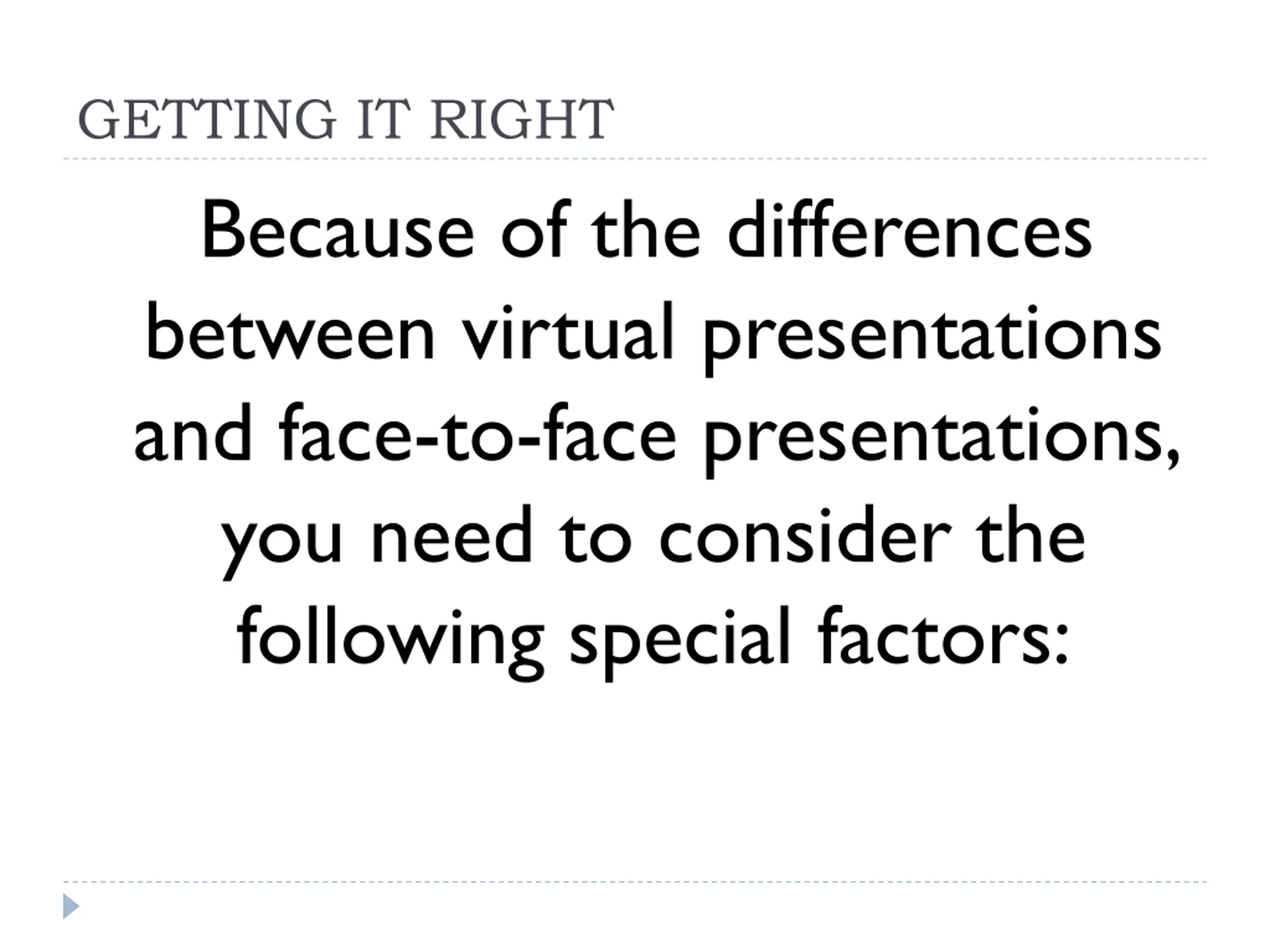 GETTING IT RIGHT Because of the differences between virtual presentations and face-to-face presentations, you need to consider the following special factors: