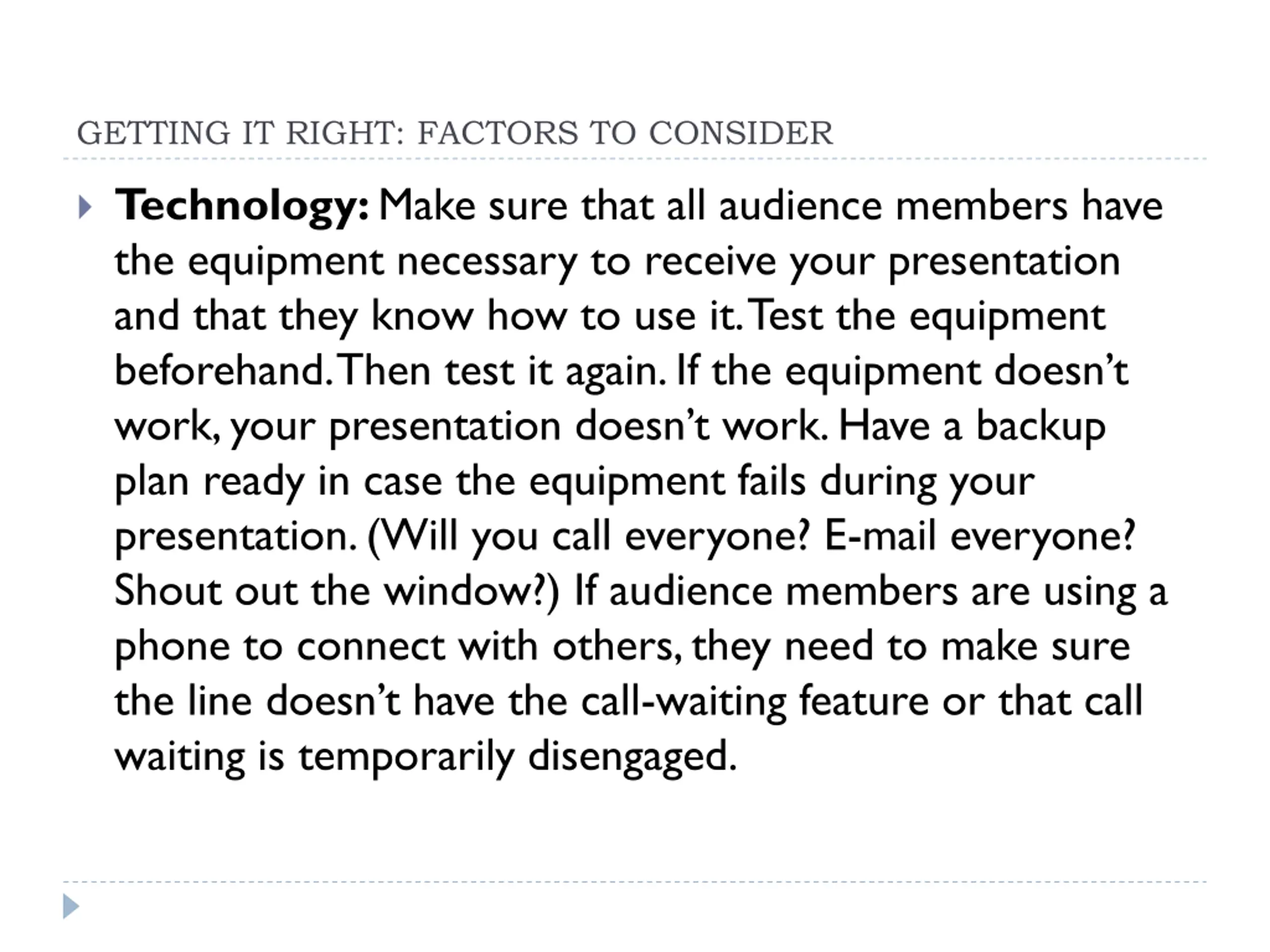 GETTING IT RIGHT: FACTORS TO CONSIDER Technology:Make sure that all audience members have the equipment necessary to receive your presentation and that they know how to use it. Test the equipment beforehand. Then test it again. If the equipment doesn t work, your presentation doesn t work. Have a backup plan ready in case the equipment fails during your presentation. (Will you call everyone? E-mail everyone? Shout out the window?) If audience members are using a phone to connect with others, they need to make sure the line doesn t have the call-waiting feature or that call waiting is temporarily disengaged.