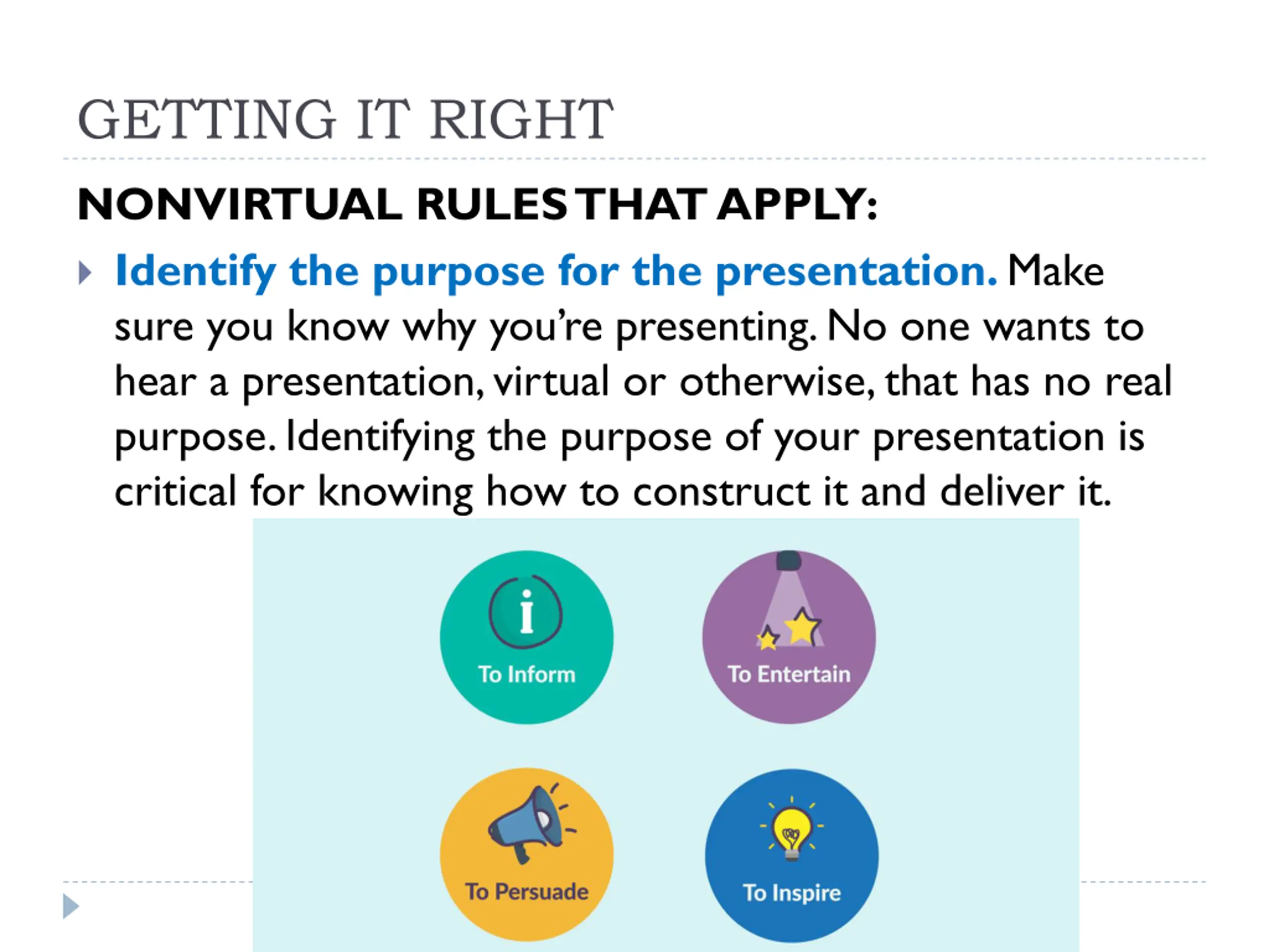 GETTING IT RIGHT NONVIRTUAL RULES THAT APPLY: Identify the purpose for the presentation.Make sure you know why you re presenting. No one wants to hear a presentation, virtual or otherwise, that has no real purpose. Identifying the purpose of your presentation is critical for knowing how to construct it and deliver it.