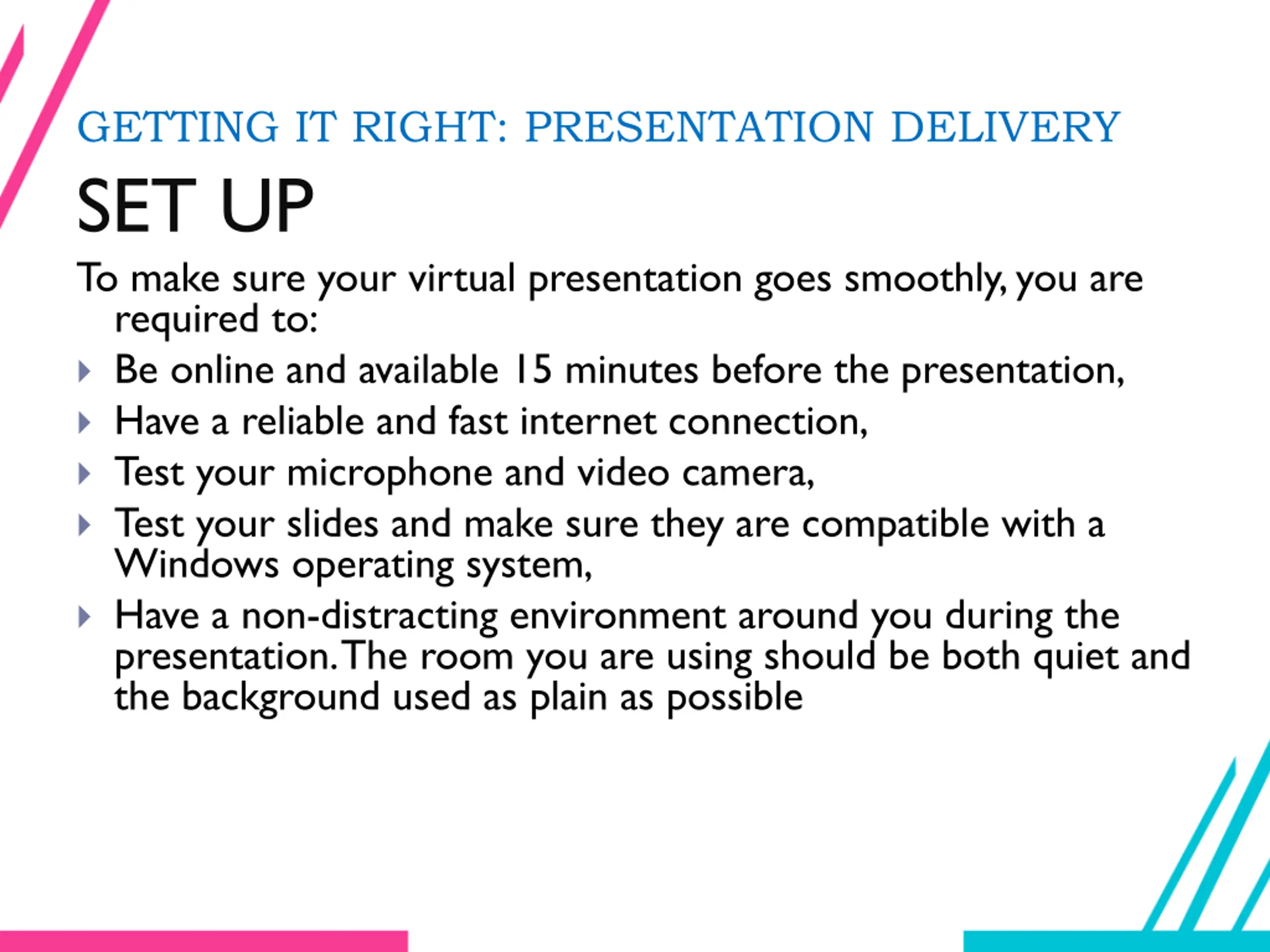 GETTING IT RIGHT: PRESENTATION DELIVERY SET UP To make sure your virtual presentation goes smoothly, you are required to: Be online and available 15 minutes before the presentation, Have a reliable and fast internet connection, Test your microphone and video camera, Test your slides and make sure they are compatible with a Windows operating system, Have a non-distracting environment around you during the presentation. The room you are using should be both quiet and the background used as plain as possible