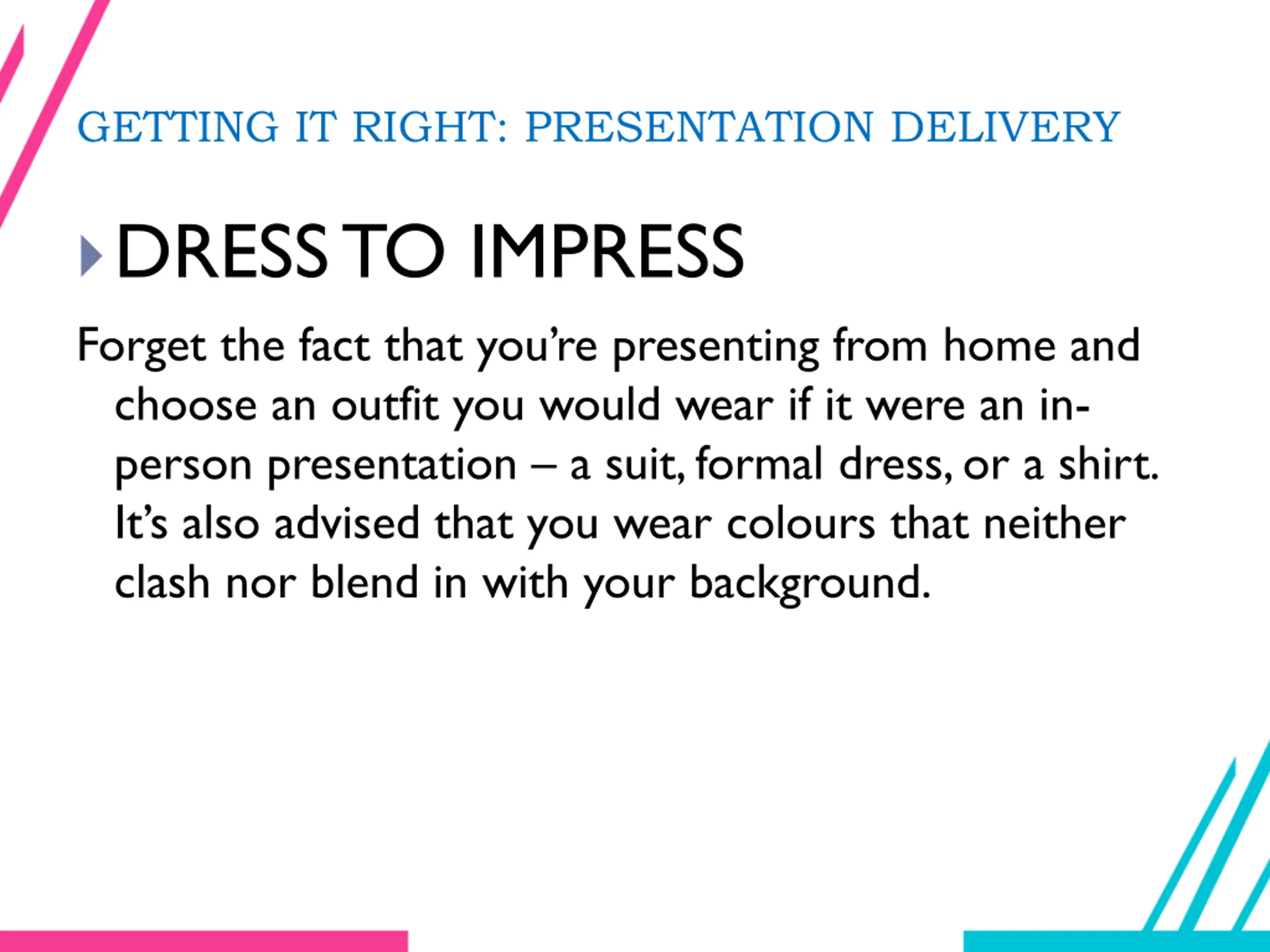 GETTING IT RIGHT: PRESENTATION DELIVERY DRESS TO IMPRESS Forget the fact that you re presenting from home and choose an outfit you would wear if it were an in- person presentation a suit, formal dress, or a shirt. It s also advised that you wear colours that neither clash nor blend in with your background.
