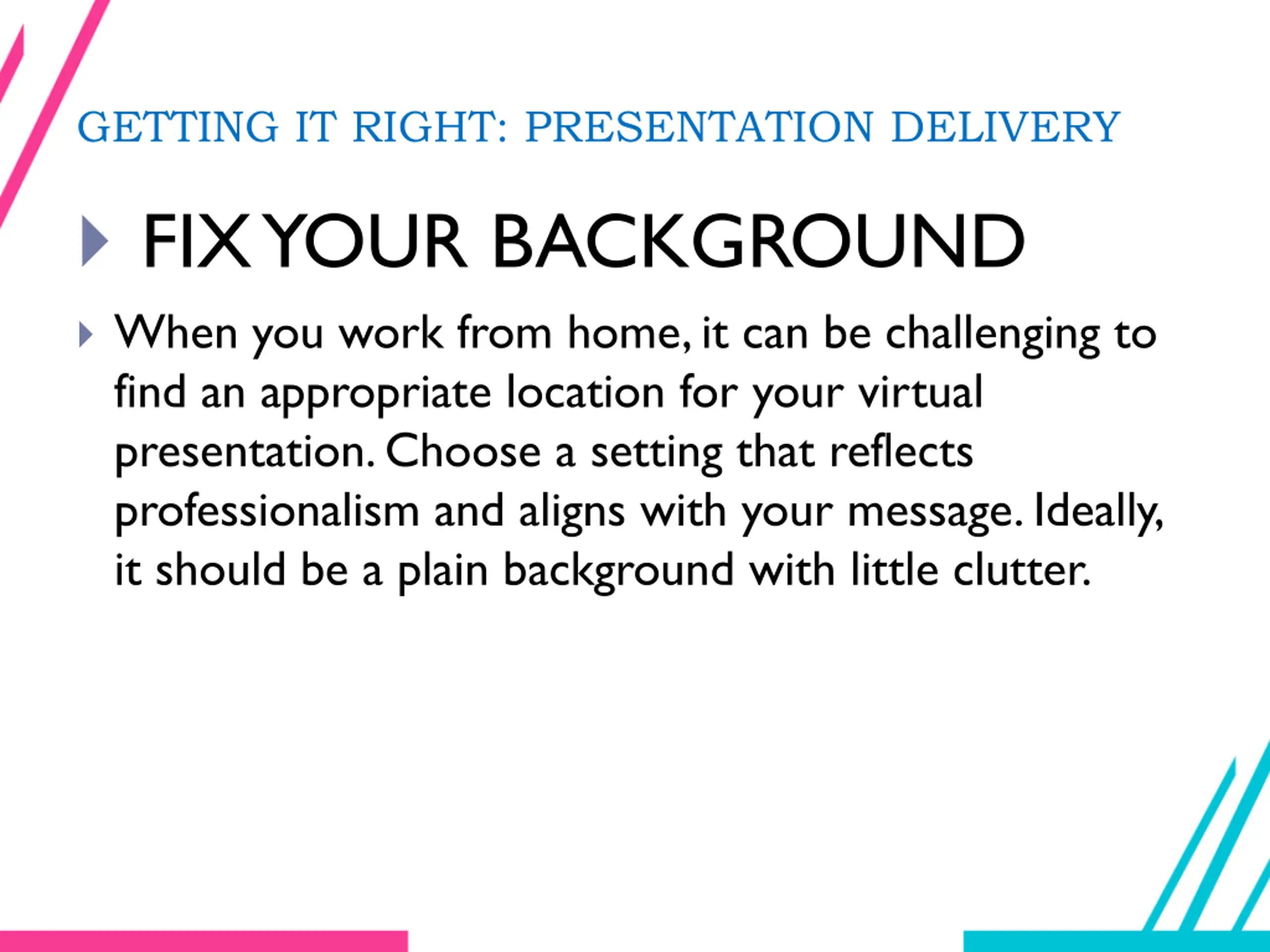 GETTING IT RIGHT: PRESENTATION DELIVERY FIX YOUR BACKGROUND When you work from home, it can be challenging to find an appropriate location for your virtual presentation. Choose a setting that reflects professionalism and aligns with your message. Ideally, it should be a plain background with little clutter.
