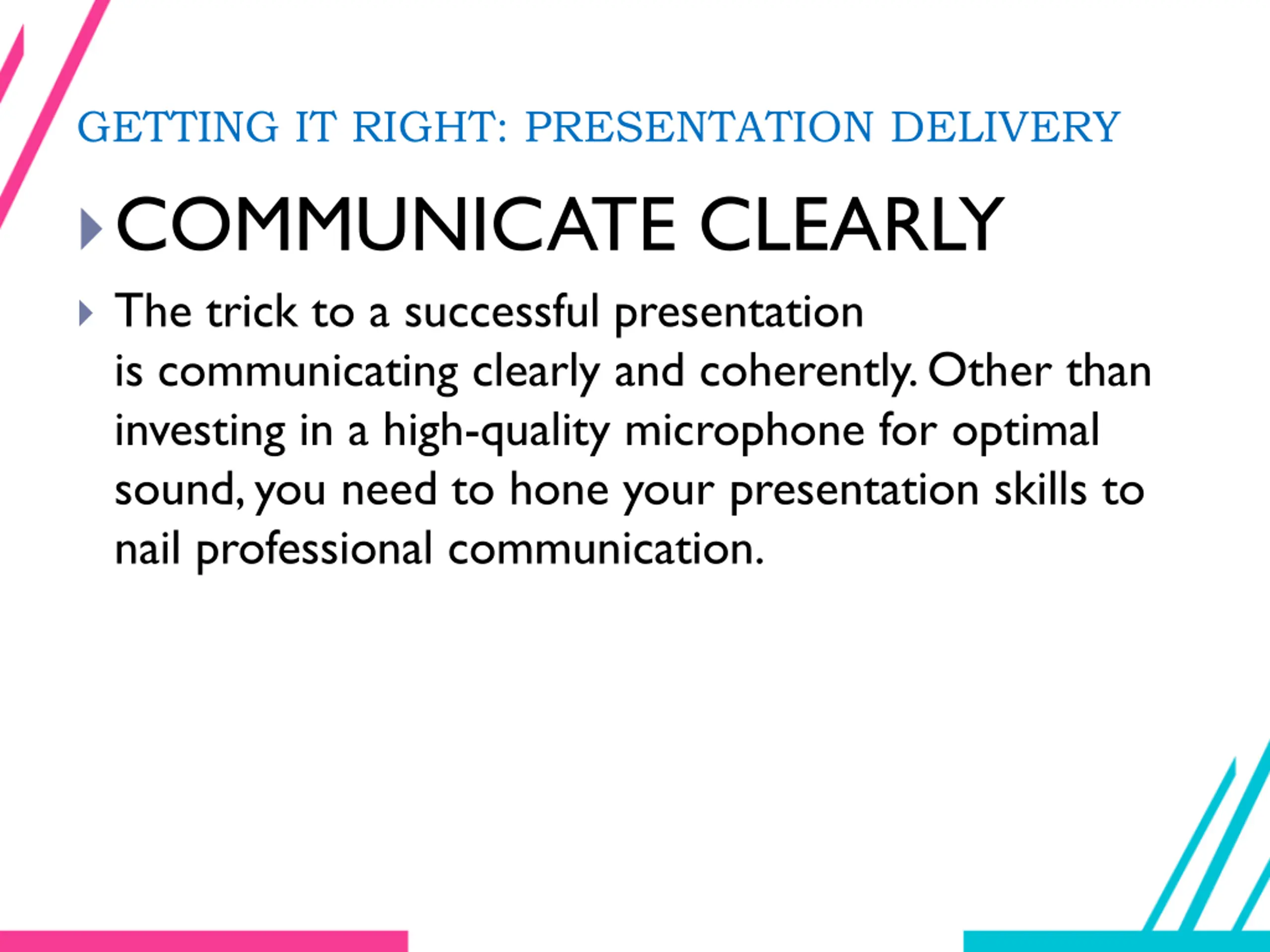 GETTING IT RIGHT: PRESENTATION DELIVERY COMMUNICATE CLEARLY The trick to a successful presentation is communicating clearly and coherently. Other than investing in a high-quality microphone for optimal sound, you need to hone your presentation skills to nail professional communication.