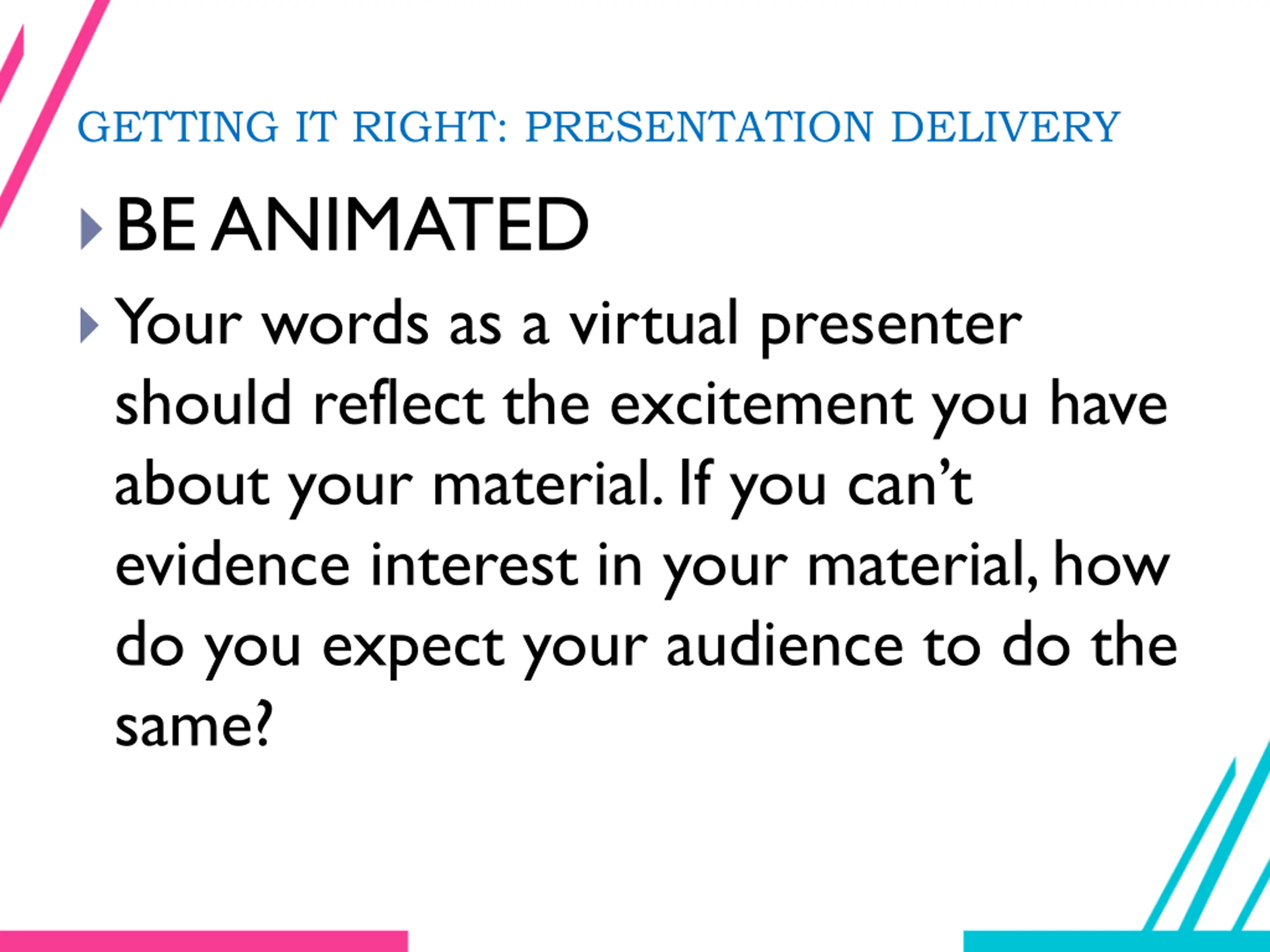 GETTING IT RIGHT: PRESENTATION DELIVERY BE ANIMATED Your words as a virtual presenter should reflect the excitement you have about your material. If you can t evidence interest in your material, how do you expect your audience to do the same?