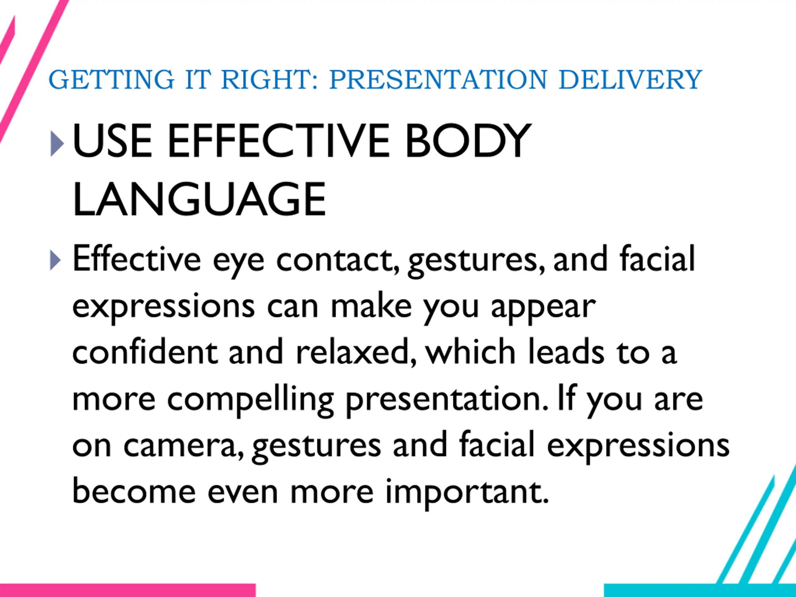 GETTING IT RIGHT: PRESENTATION DELIVERY USE EFFECTIVE BODY LANGUAGE Effective eye contact, gestures, and facial expressions can make you appear confident and relaxed, which leads to a more compelling presentation. If you are on camera, gestures and facial expressions become even more important.