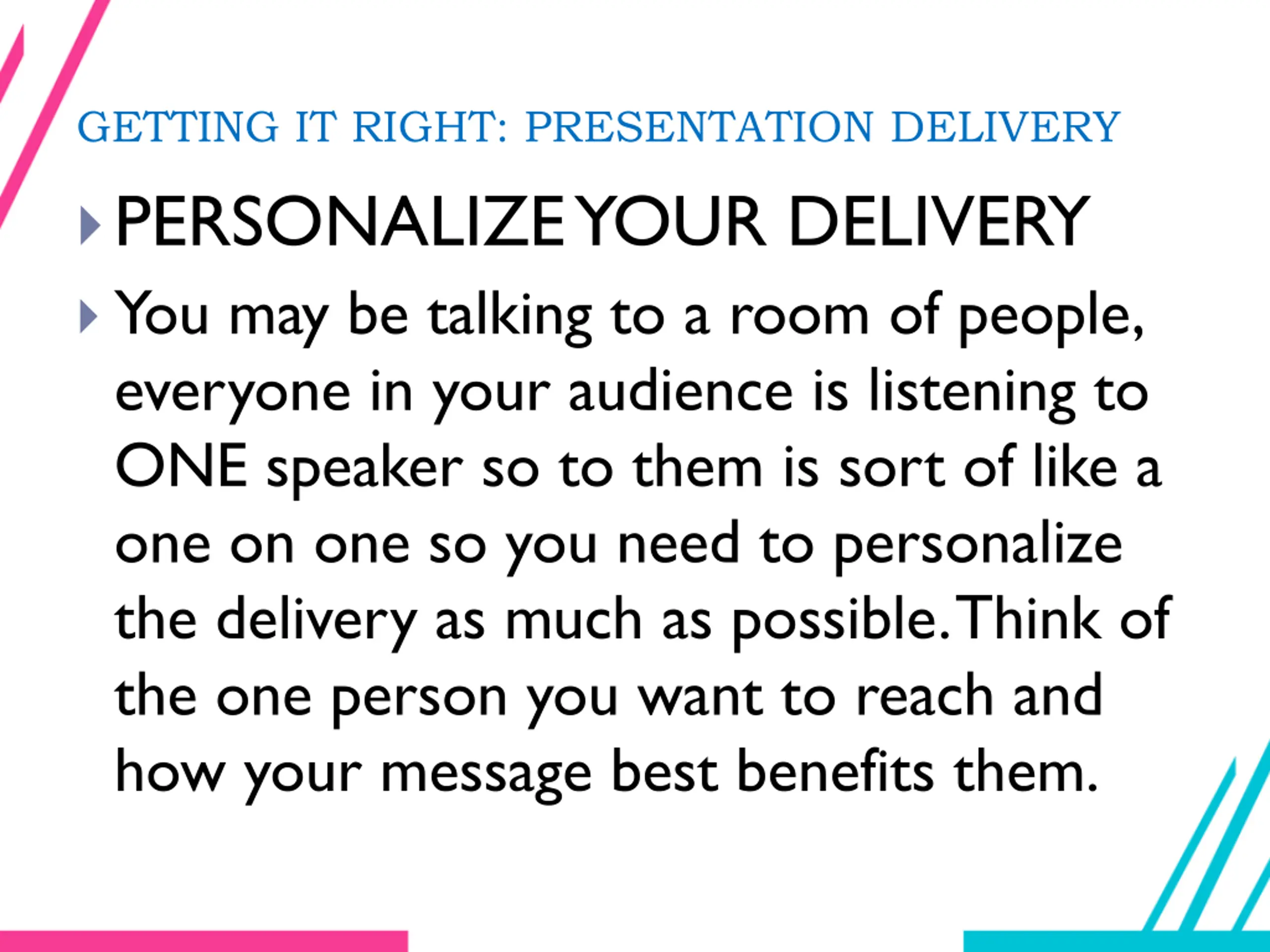 GETTING IT RIGHT: PRESENTATION DELIVERY PERSONALIZE YOUR DELIVERY You may be talking to a room of people, everyone in your audience is listening to ONE speaker so to them is sort of like a one on one so you need to personalize the delivery as much as possible. Think of the one person you want to reach and how your message best benefits them.