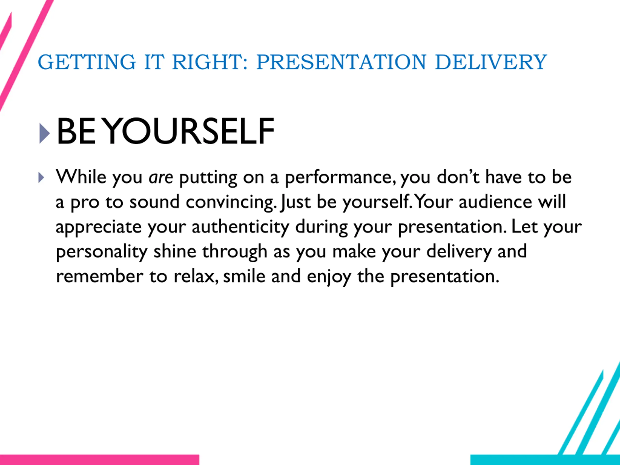 GETTING IT RIGHT: PRESENTATION DELIVERY BE YOURSELF While you are putting on a performance, you don t have to be a pro to sound convincing. Just be yourself. Your audience will appreciate your authenticity during your presentation. Let your personality shine through as you make your delivery and remember to relax, smile and enjoy the presentation.