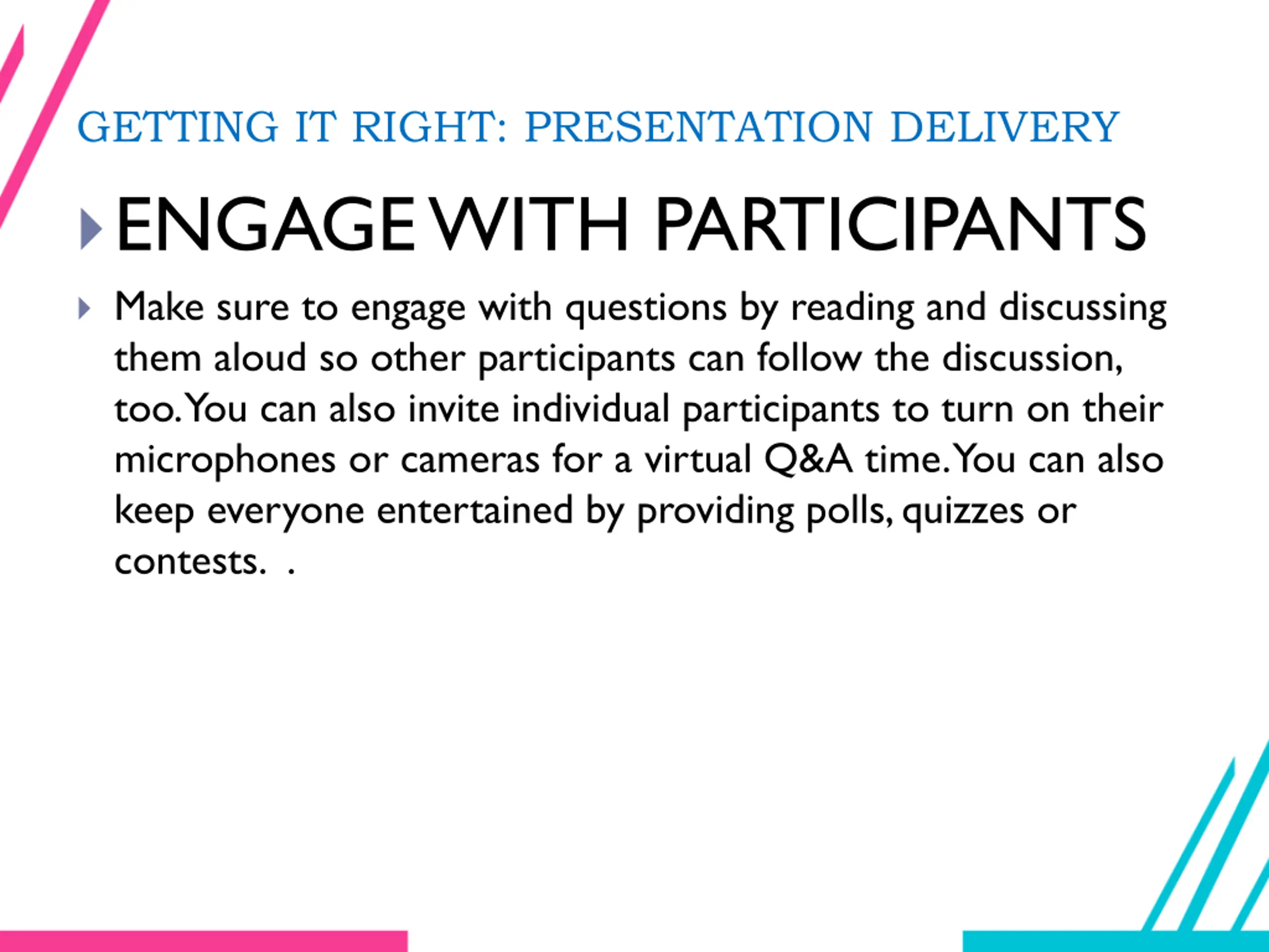 GETTING IT RIGHT: PRESENTATION DELIVERY ENGAGE WITH PARTICIPANTS Make sure to engage with questions by reading and discussing them aloud so other participants can follow the discussion, too. You can also invite individual participants to turn on their microphones or cameras for a virtual Q&A time. You can also keep everyone entertained by providing polls, quizzes or contests. .