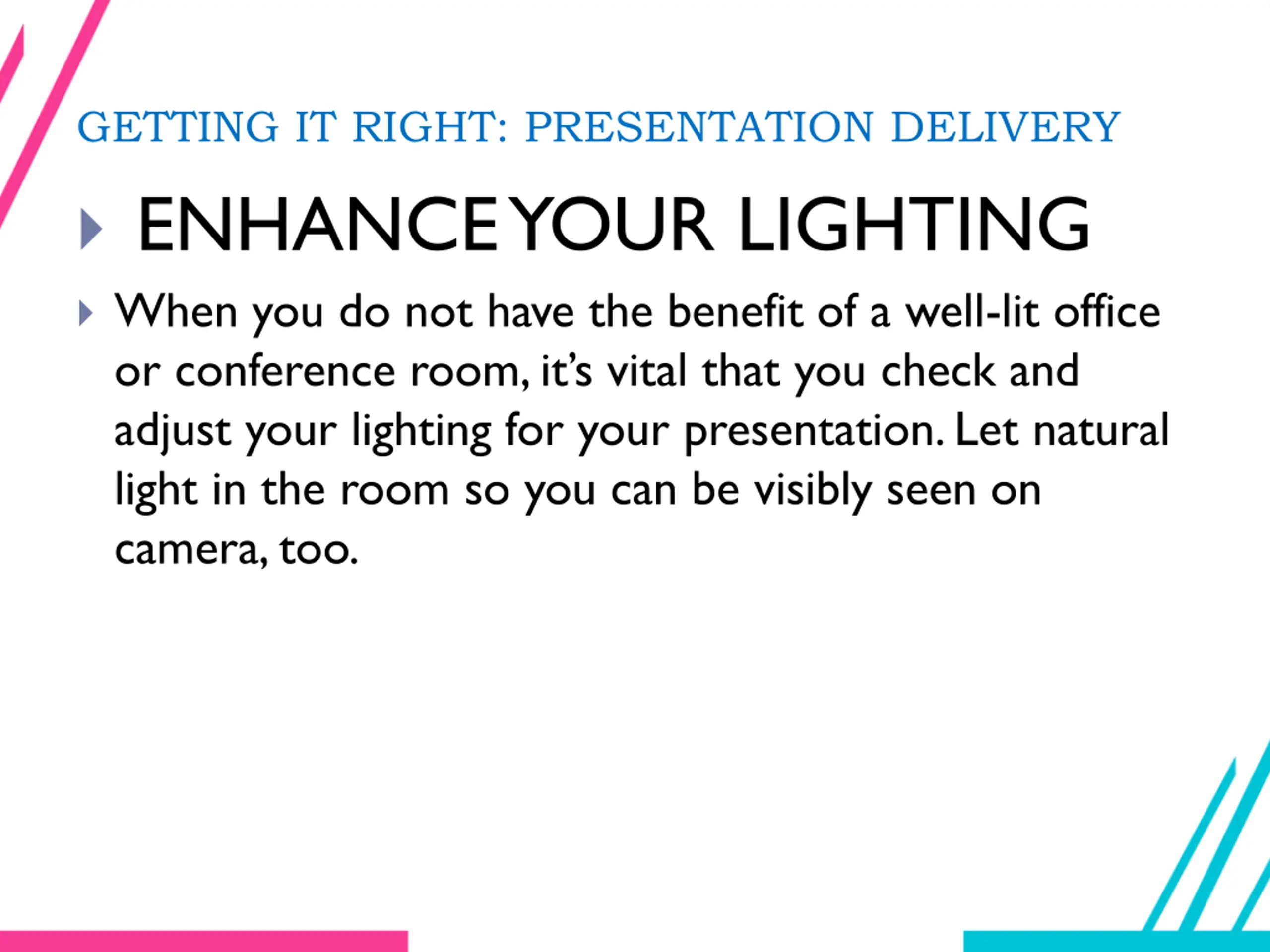 GETTING IT RIGHT: PRESENTATION DELIVERY ENHANCE YOUR LIGHTING When you do not have the benefit of a well-lit office or conference room, it s vital that you check and adjust your lighting for your presentation. Let natural light in the room so you can be visibly seen on camera, too.