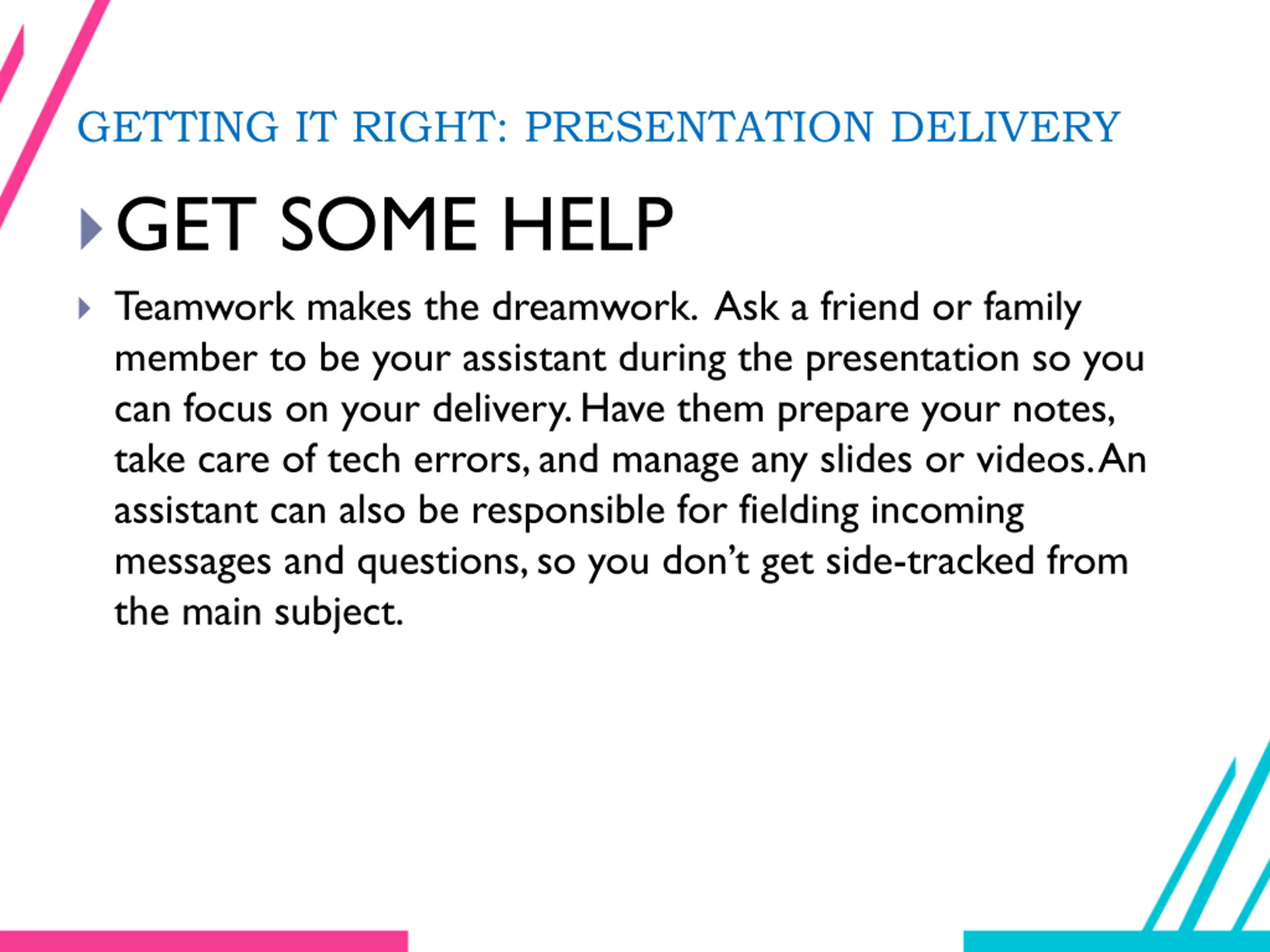 GETTING IT RIGHT: PRESENTATION DELIVERY GET SOME HELP Teamwork makes the dreamwork. Ask a friend or family member to be your assistant during the presentation so you can focus on your delivery. Have them prepare your notes, take care of tech errors, and manage any slides or videos. An assistant can also be responsible for fielding incoming messages and questions, so you don t get side-tracked from the main subject.