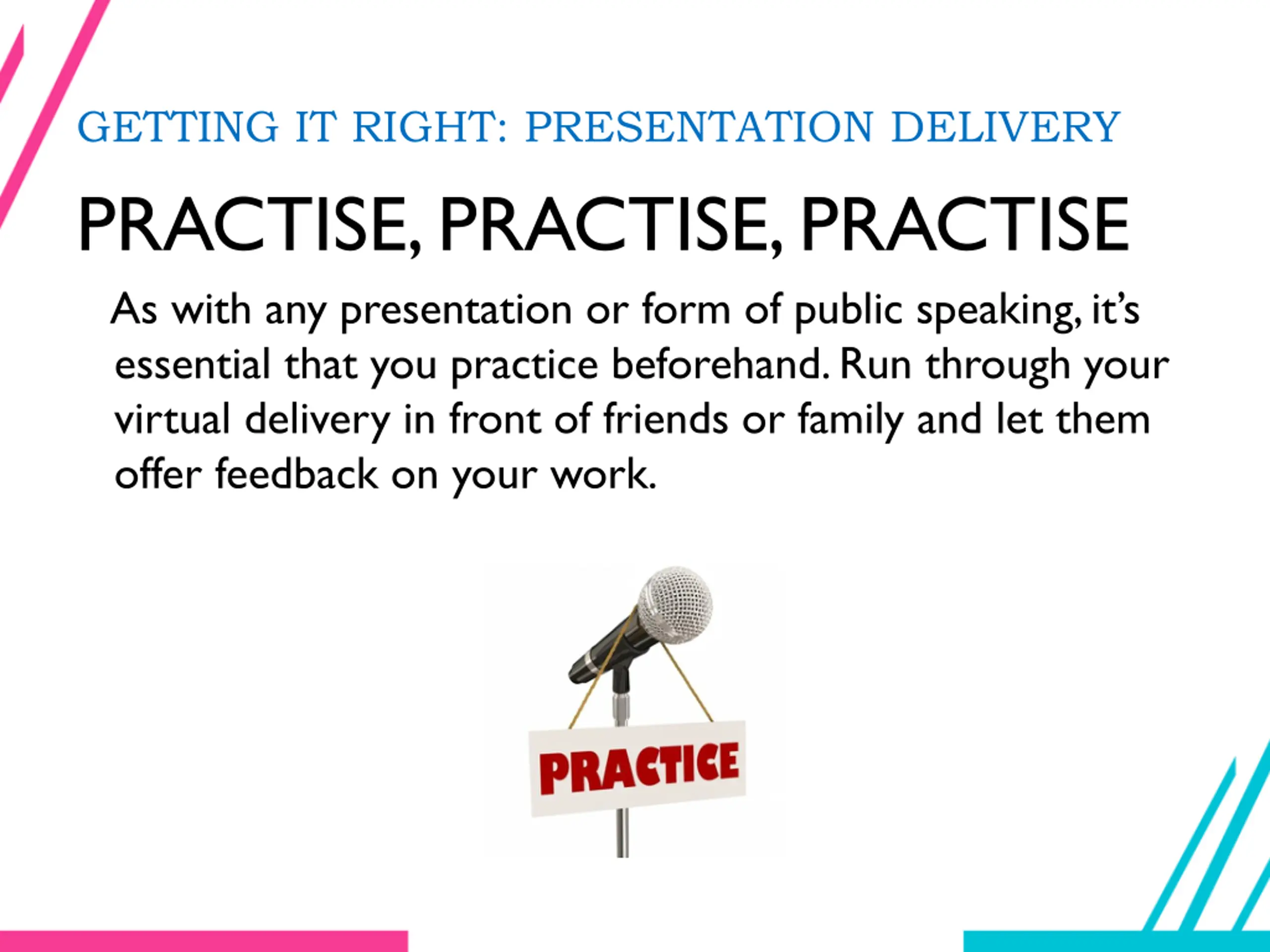 GETTING IT RIGHT: PRESENTATION DELIVERY PRACTISE, PRACTISE, PRACTISE As with any presentation or form of public speaking, it s essential that you practice beforehand. Run through your virtual delivery in front of friends or family and let them offer feedback on your work.