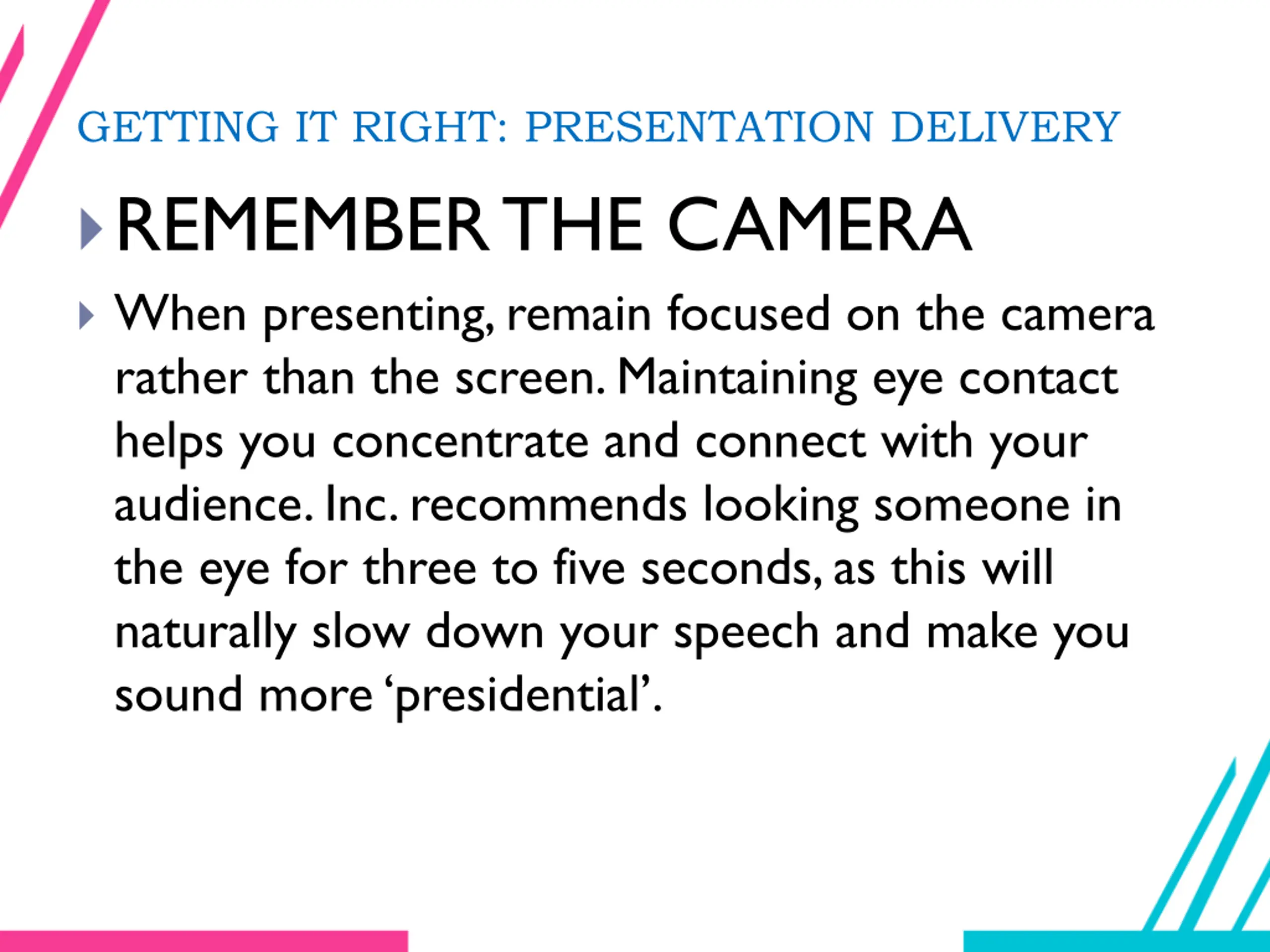 GETTING IT RIGHT: PRESENTATION DELIVERY REMEMBER THE CAMERA When presenting, remain focused on the camera rather than the screen. Maintaining eye contact helps you concentrate and connect with your audience.Inc.recommends looking someone in the eye for three to five seconds, as this will naturally slow down your speech and make you sound more presidential .