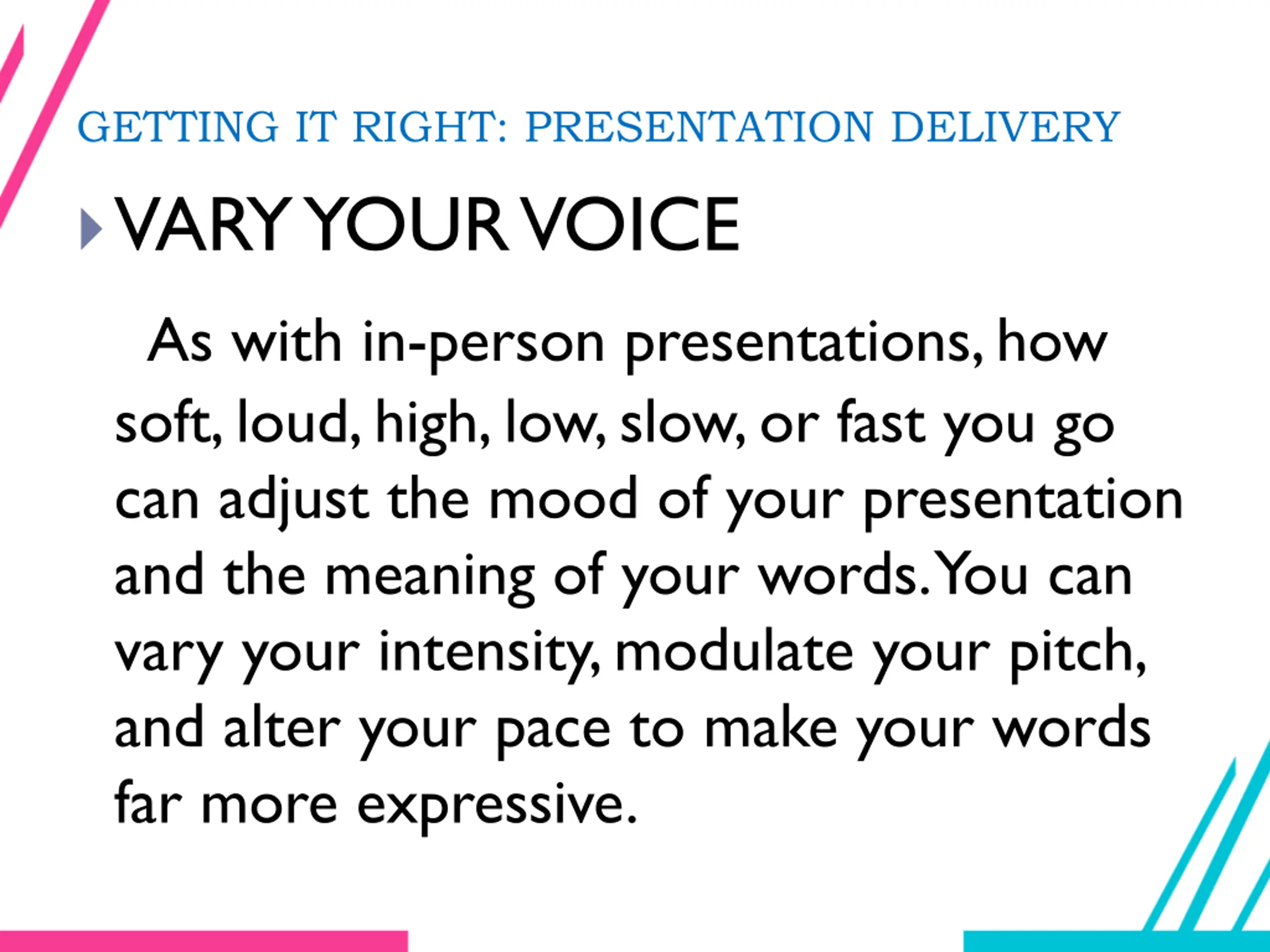 GETTING IT RIGHT: PRESENTATION DELIVERY VARY YOUR VOICE As with in-person presentations, how soft, loud, high, low, slow, or fast you go can adjust the mood of your presentation and the meaning of your words. You can vary your intensity, modulate your pitch, and alter your pace to make your words far more expressive.