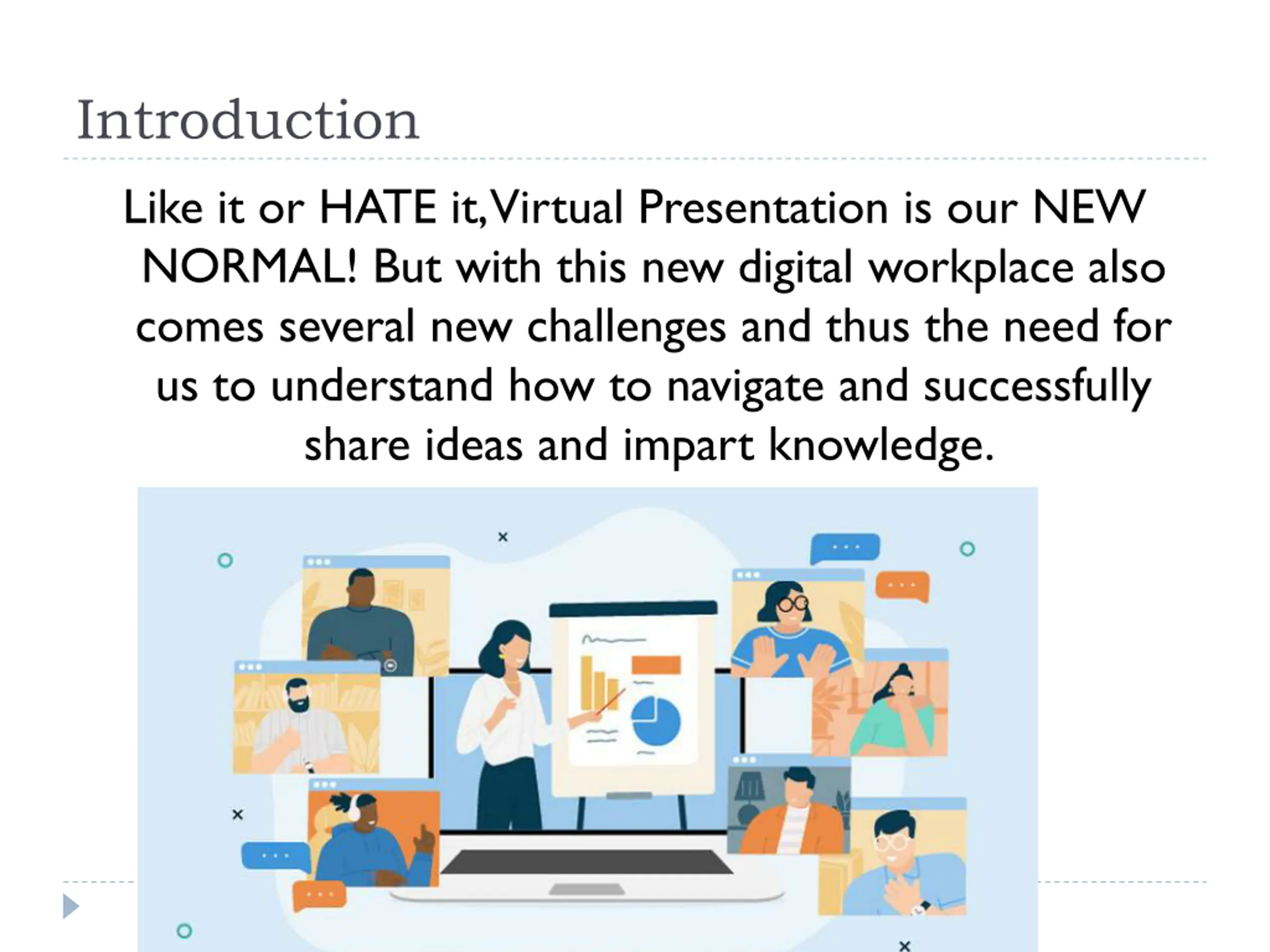 Introduction Like it or HATE it, Virtual Presentation is our NEW NORMAL! But with this new digital workplace also comes several new challenges and thus the need for us to understand how to navigate and successfully share ideas and impart knowledge.