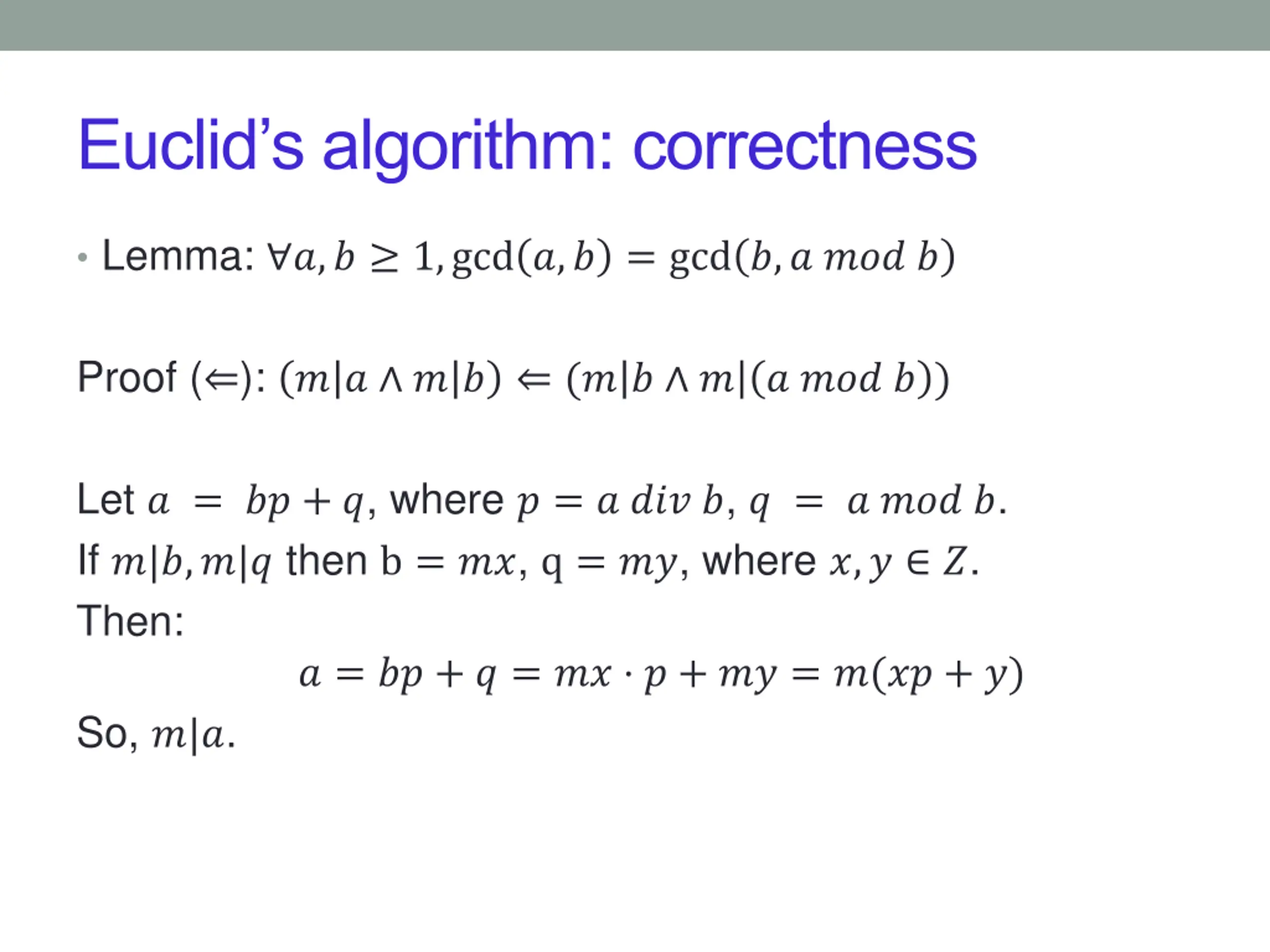 Euclids algorithm: correctness Lemma: ?,? 1,gcd ?,? = gcd ?,? ??? ? Proof ( ): ? ? ? ? (? ? ? ? ??? ? ) Let ? = ?? + ?, where ? = ? ??? ?, ? = ? ??? ?. If ?|?,?|? then b = ??, q = ??, where ?,? ?. Then: ? = ?? + ? = ?? ? + ?? = ?(?? + ?) So, ?|?.