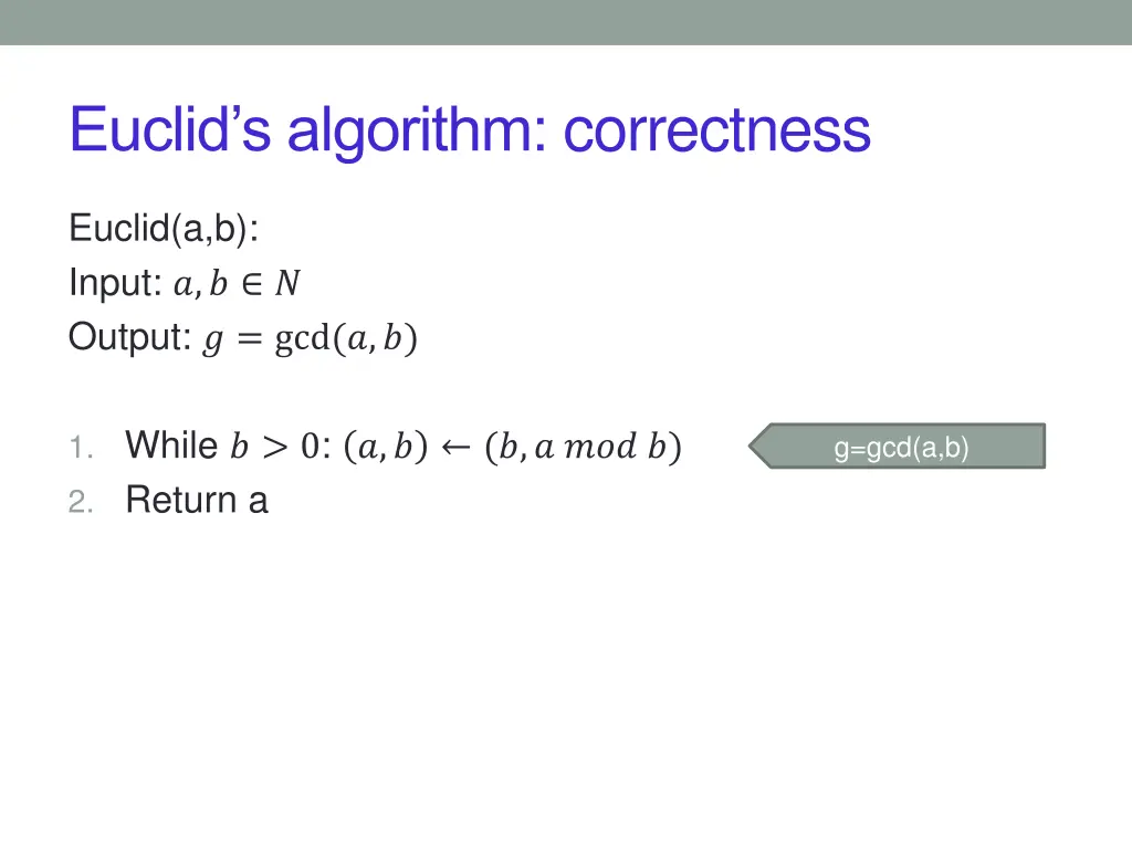 Euclids algorithm: correctness Euclid(a,b): Input: ?,? ? Output: ? = gcd(?,?) 1. While ? > 0: ?,? (?,? ??? ?) 2. Return a g=gcd(a,b) Proved!