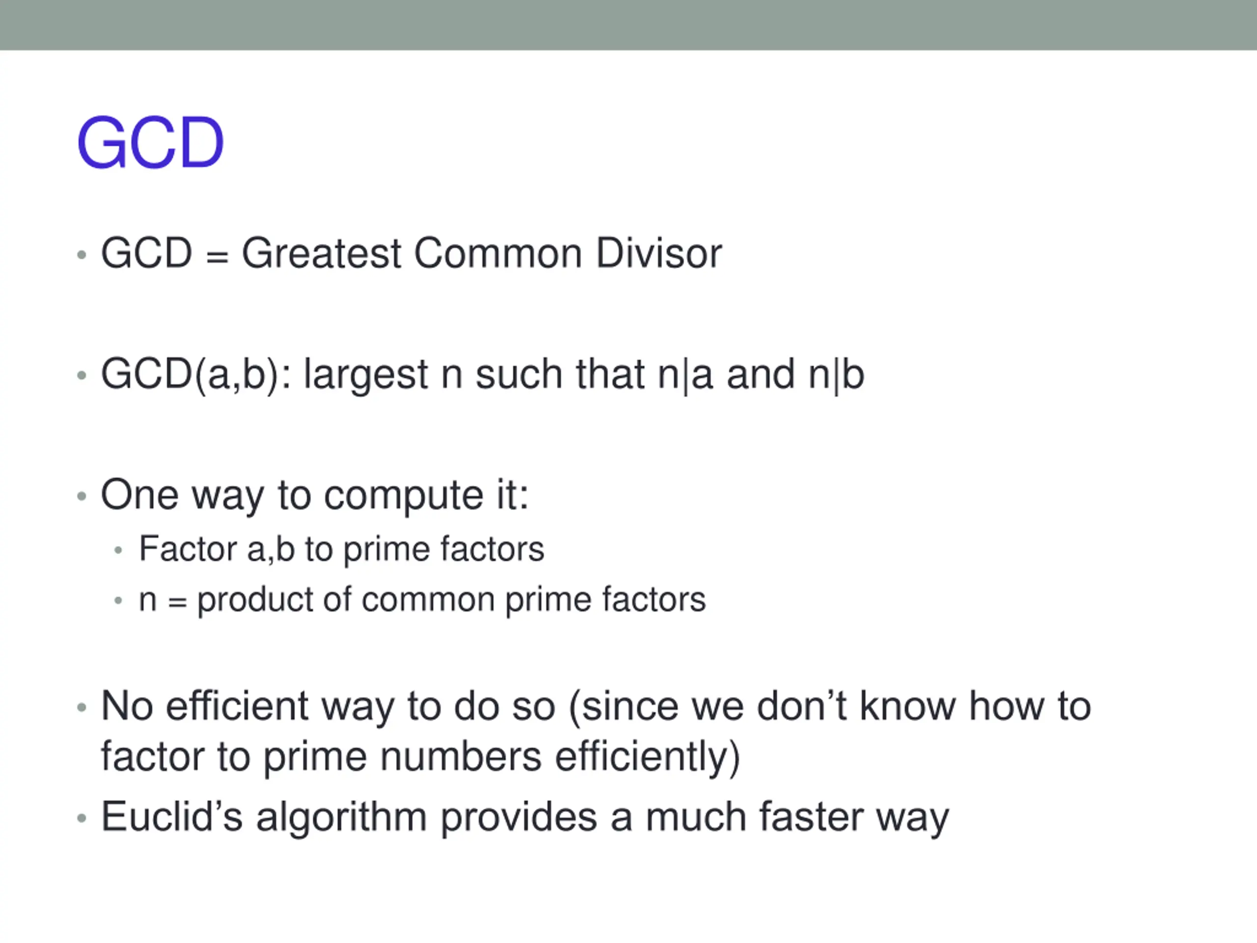 GCD GCD = Greatest Common Divisor GCD(a,b): largest n such that n|a and n|b One way to compute it: Factor a,b to prime factors n = product of common prime factors No efficient way to do so (since we don t know how to factor to prime numbers efficiently) Euclid s algorithm provides a much faster way