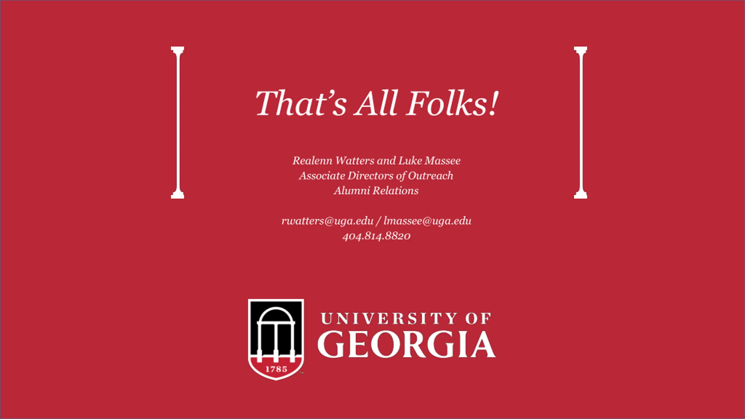 Thats All Folks! Realenn Watters and Luke Massee Associate Directors of Outreach Alumni Relations rwatters@uga.edu / lmassee@uga.edu 404.814.8820