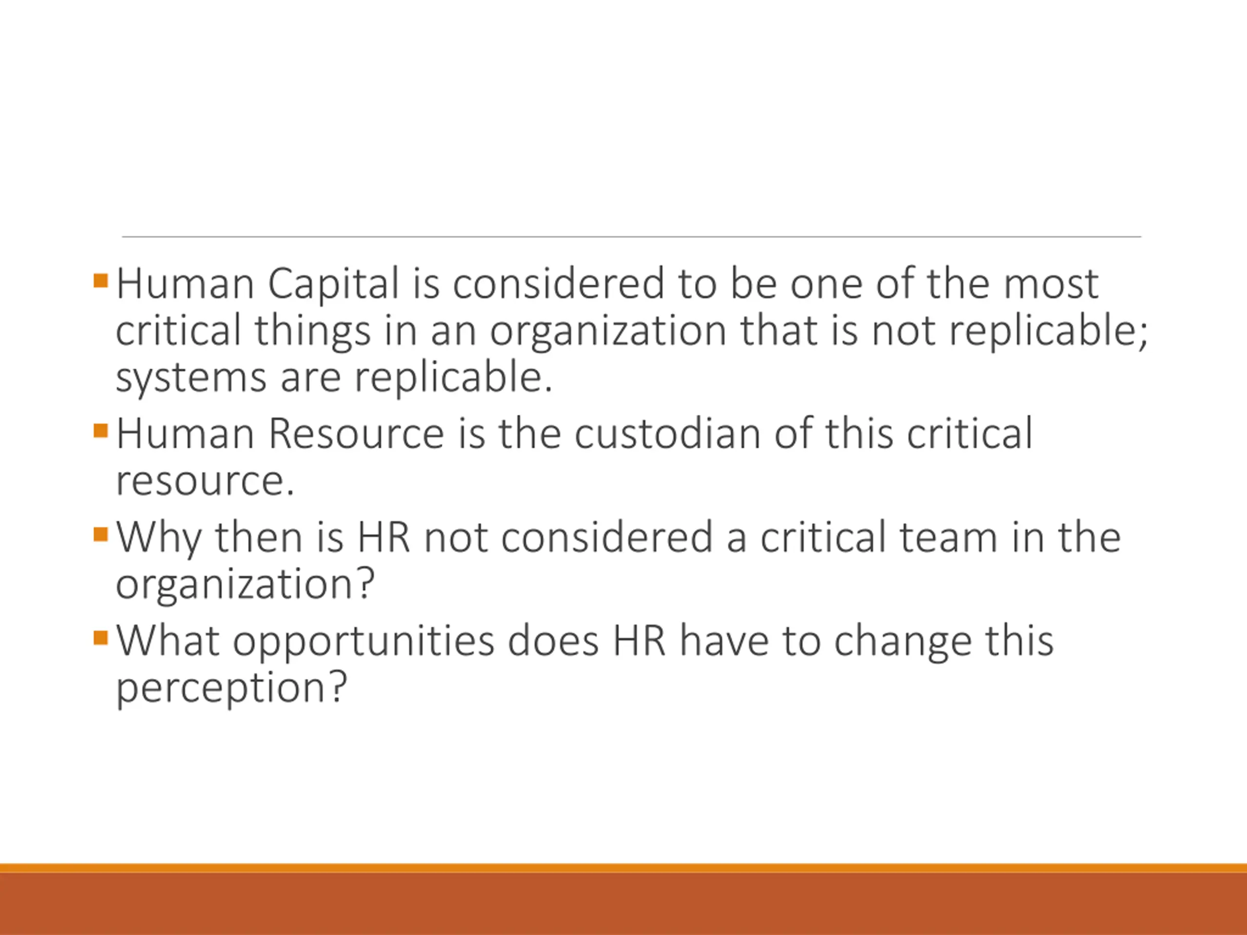 Human Capital is considered to be one of the most critical things in an organization that is not replicable; systems are replicable. Human Resource is the custodian of this critical resource. Why then is HR not considered a critical team in the organization? What opportunities does HR have to change this perception?