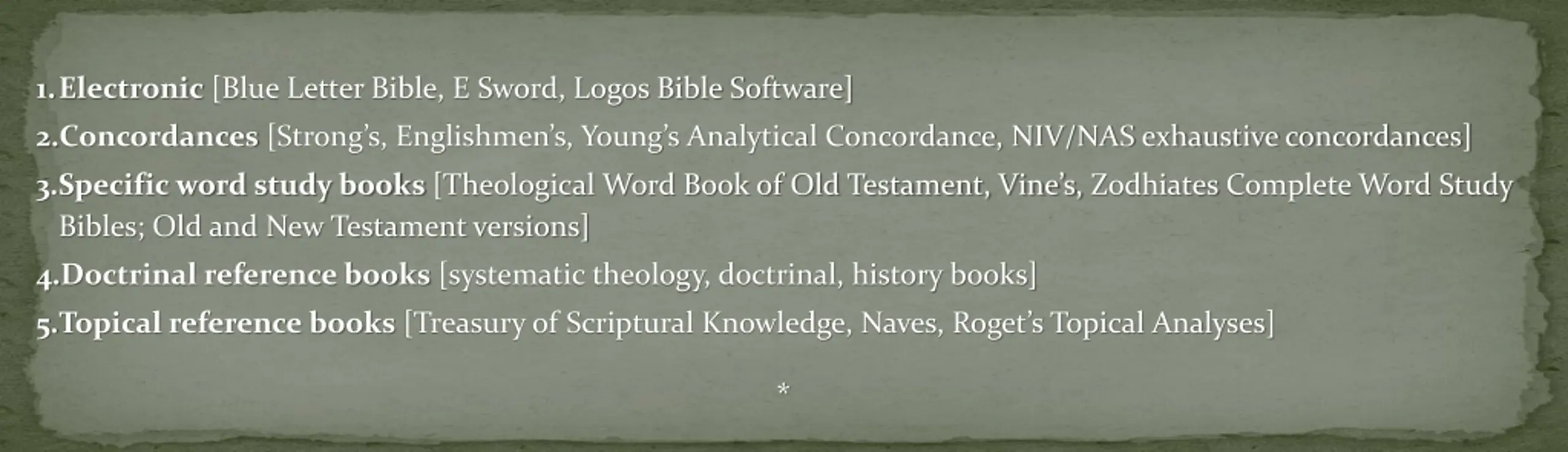 1.Electronic [Blue Letter Bible, E Sword, Logos Bible Software] 2.Concordances[Strong s, Englishmen s, Young s Analytical Concordance, NIV/NAS exhaustive concordances] 3.Specific word study books[Theological Word Book of Old Testament, Vine s, Zodhiates Complete Word Study Bibles; Old and New Testament versions] 4.Doctrinal reference books [systematic theology, doctrinal, history books] 5.Topical reference books[Treasury of Scriptural Knowledge, Naves, Roget s Topical Analyses] *
