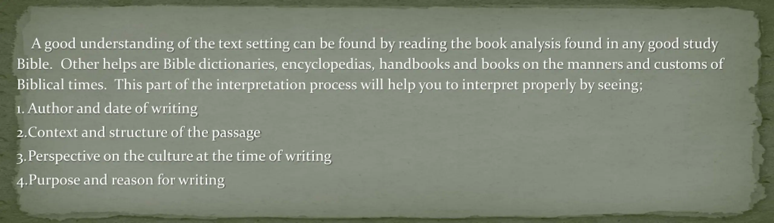A good understanding of the text setting can be found by reading the book analysis found in any good study Bible. Other helps are Bible dictionaries, encyclopedias, handbooks and books on the manners and customs of Biblical times. This part of the interpretation process will help you to interpret properly by seeing; 1.Author and date of writing 2.Context and structure of the passage 3.Perspective on the culture at the time of writing 4.Purpose and reason for writing