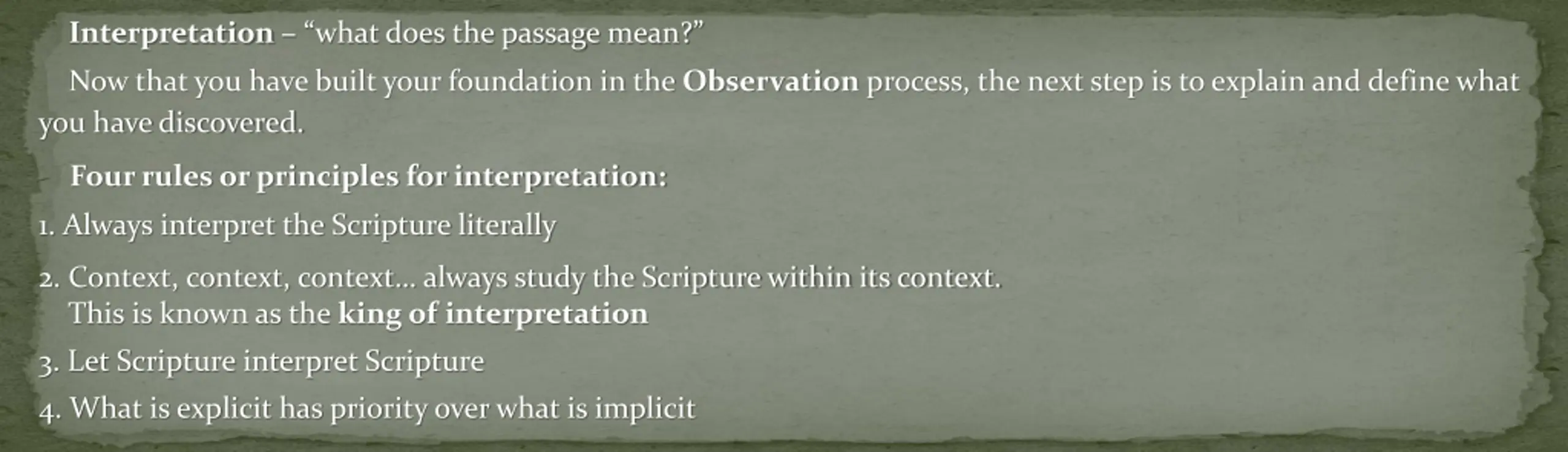 Interpretation what does the passage mean? Now that you have built your foundation in the Observation process, the next step is to explain and define what you have discovered. Four rules or principles for interpretation: 1. Always interpret the Scripture literally 2. Context, context, context always study the Scripture within its context. This is known as the king of interpretation 3. Let Scripture interpret Scripture 4. What is explicit has priority over what is implicit