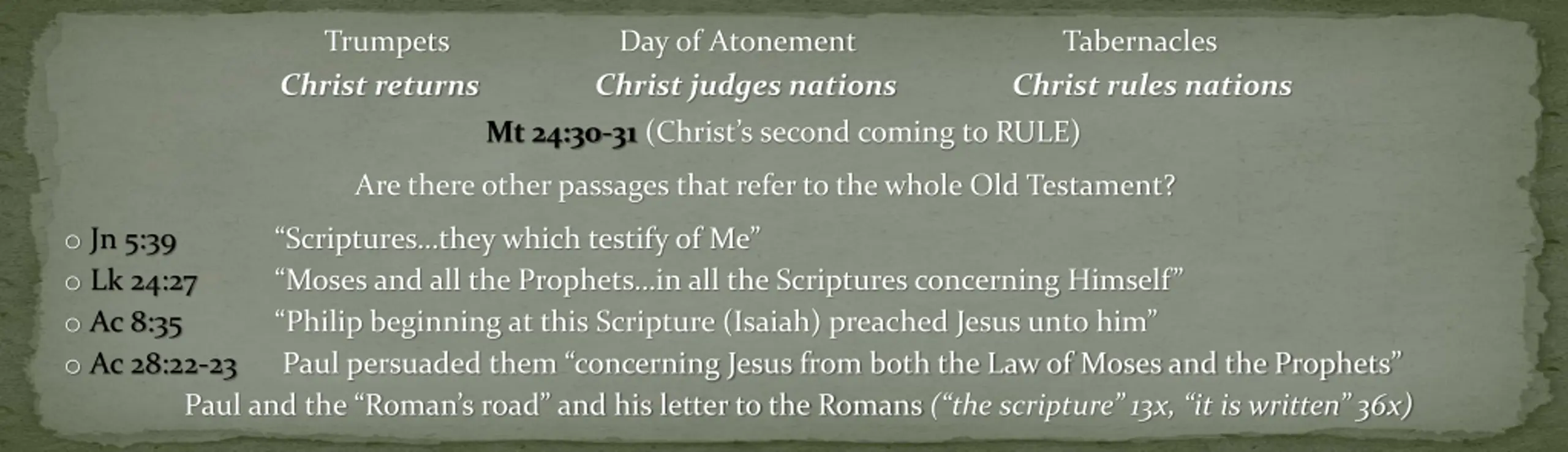 Trumpets Christ returns Day of Atonement Christ judges nations Tabernacles Christ rules nations Mt 24:30-31(Christ s second coming to RULE) Are there other passages that refer to the whole Old Testament? o Jn 5:39 o Lk 24:27 o Ac 8:35 o Ac 28:22-23 Scriptures they which testify of Me Moses and all the Prophets in all the Scriptures concerning Himself Philip beginning at this Scripture (Isaiah) preached Jesus unto him Paul persuaded them concerning Jesus from both the Law of Moses and the Prophets Paul and the Roman s road and his letter to the Romans ( the scripture 13x, it is written 36x)