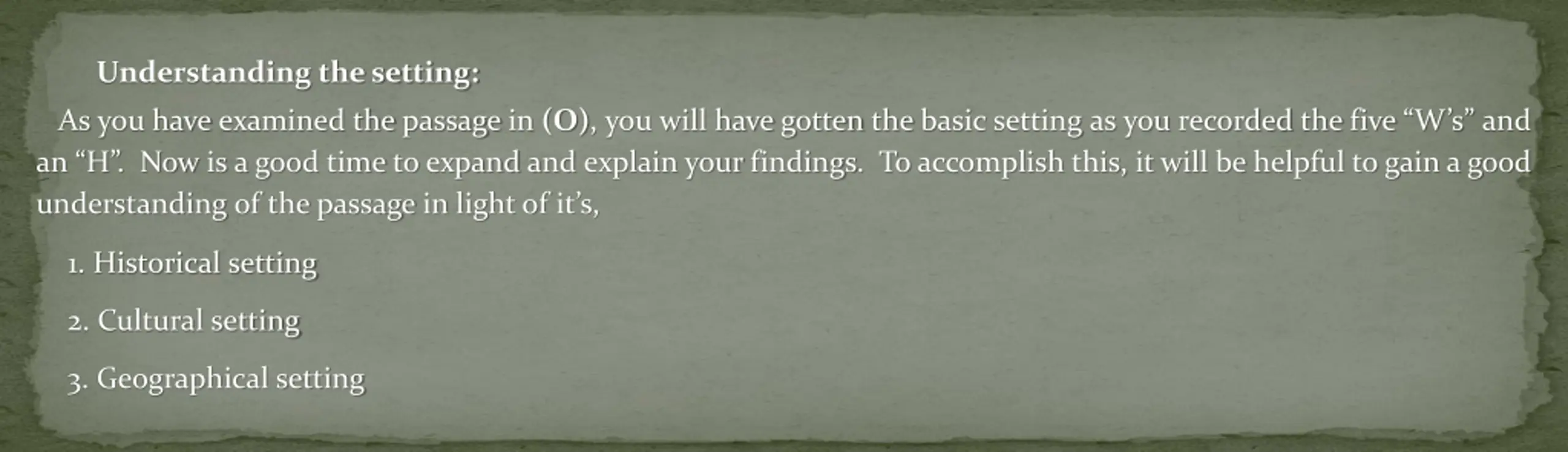 Understanding the setting: As you have examined the passage in (O), you will have gotten the basic setting as you recorded the five W s and an H . Now is a good time to expand and explain your findings. To accomplish this, it will be helpful to gain a good understanding of the passage in light of it s, 1. Historical setting 2. Cultural setting 3. Geographical setting